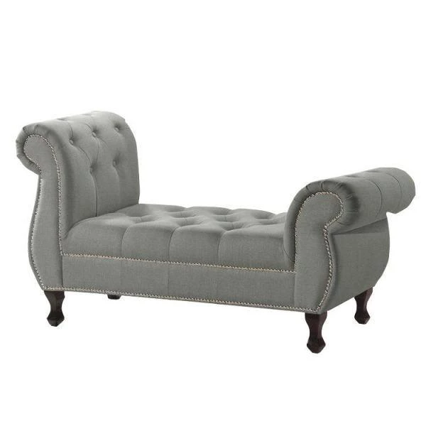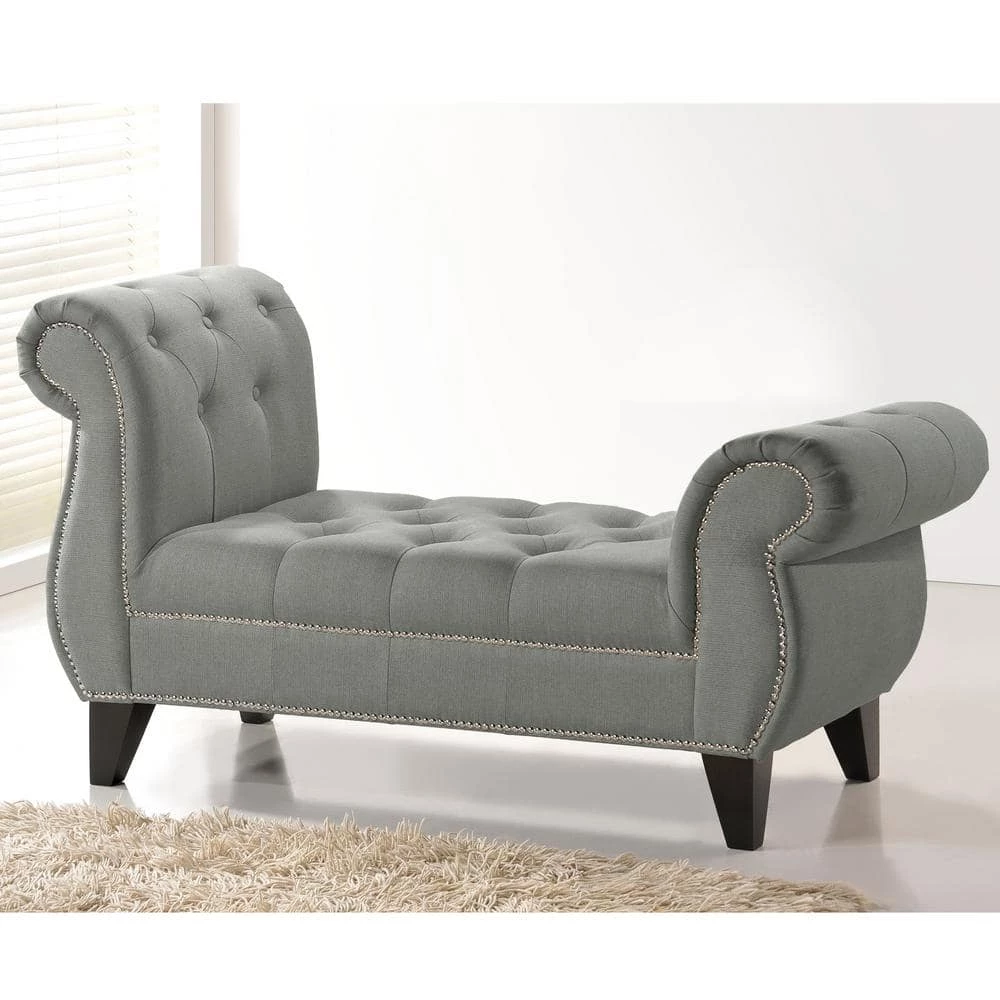 Calling all discount-savvy divas. Enhance your bedroom with elegance and style. Boasting grey linen with silver nail head trim, smooth scroll arms and contrasting contoured black wood legs, our contemporary bedroom bench also emphasizes comfort with tufted seat, rubberwood frame and foam padding.
