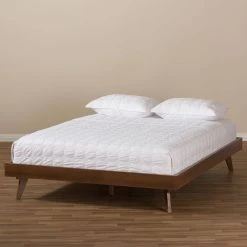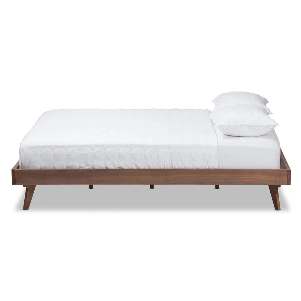 Gorgeously minimal platform bed crafted from solid rubberwood frame with walnut wood veneer finishing, the Jacob will perfectly fit for an apartment or a small space set up. With squared corners and a center support for added durability, the Jacob includes a sturdy slatted platform so no box spring is needed. The angled wooden legs, crafted minimally with clean lines imbues mid century modern design for retro look. Made in Malaysia, the Jacob requires assembly.