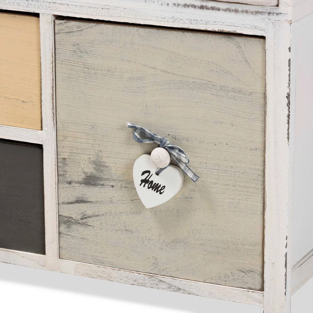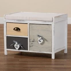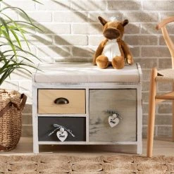 Elevate the efficacy of your entryway with the versatile design of the Jacoby storage bench. Made in China, this bench is made from sturdy wood. 3-drawers offer convenient storage for shoes and other outdoor essentials while the plush, foam-padded cushion provides convenient comfort. The Jacoby will arrive fully assembled features heart-shaped wood drawer pulls that exude a charming, homey feel. A delightful design that exudes laidback personality, the Jacoby storage bench is a fantastic addition to the modern home.
