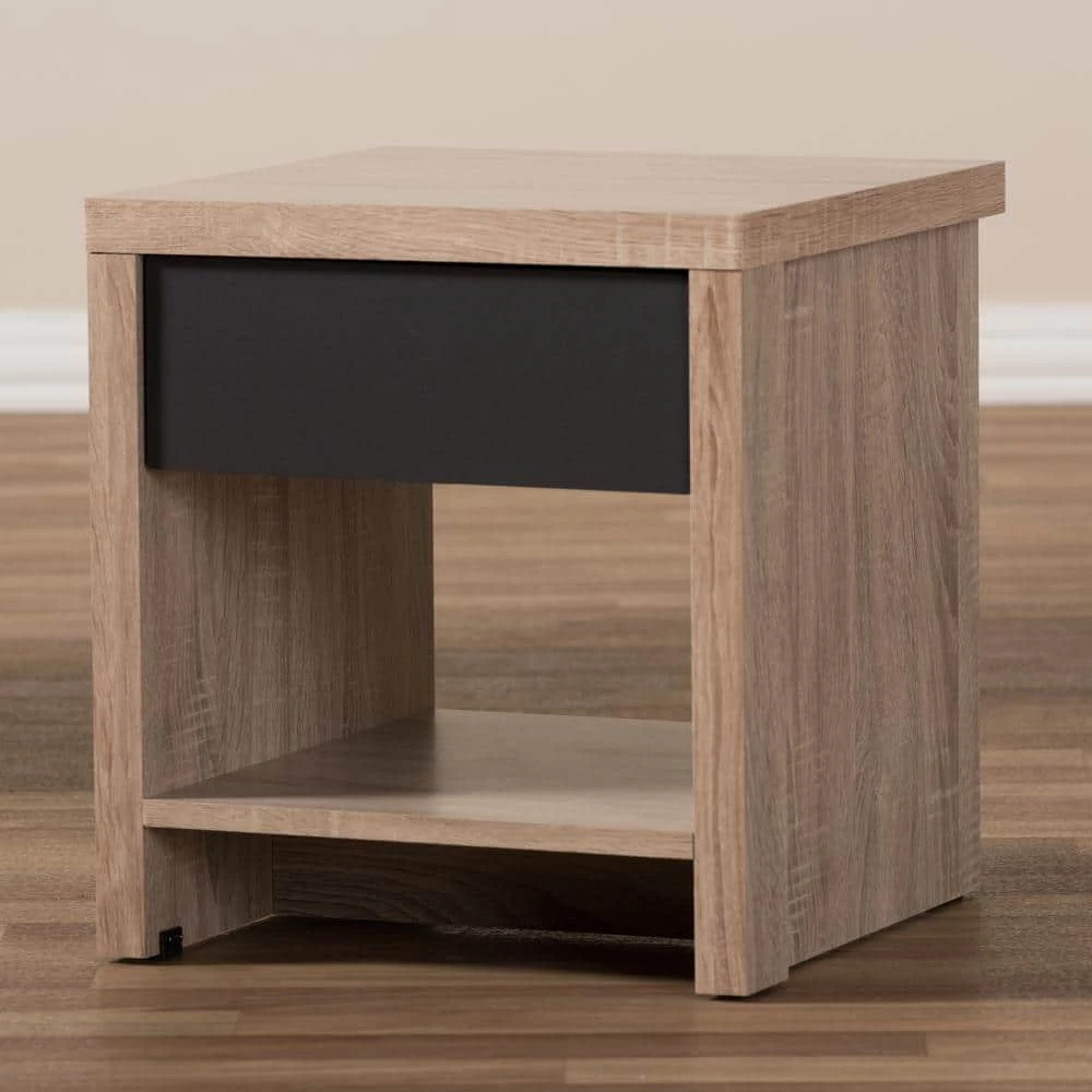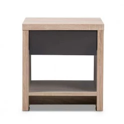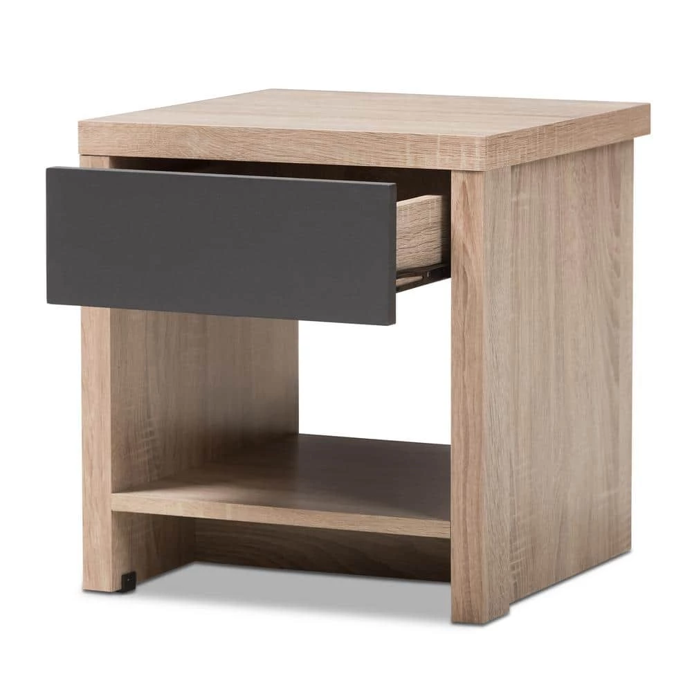 Complement your bedroom with clever balance of colors and ample storage in the Jamie modern and contemporary nightstand. Featuring modern and minimalist design, the Jamie is constructed of engineered wood in oak and grey two-tone finishing, creating a contrast but soothing effect. The drawer and the open shelf are perfect for storing your bedroom accessories while displaying a photograph or bouquet of flowers on the top surface. Drawers feature metal extension runners for smooth movement. Clever use of oak and grey two-tone finishing bring handsome style to your color palette with an effortless look to last years in your bedroom. Made in Malaysia, the Jamie bed side table requires assembly.