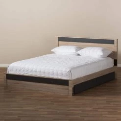 Keep your bedroom knick-knacks tidily concealed but conveniently on-hand with the Jamie 2-drawer storage queen platform bed. Constructed of engineered wood in oak and grey two-tone finishing, the Jamie features platform bed base with sturdiness and durability with good looks to last. Two pull-out drawers on hidden wheels in the base, one on each side, provide ample storage for spare blankets and linens for practical and easy access. This 2-drawer storage bed complements contemporary designs whilst perfect for coordinating with various color schemes. Made in Malaysia, the platform bed requires assembly.