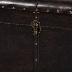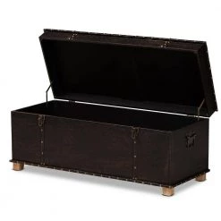 Organize your space with the robust and practical design of the Janna storage ottoman. Made in China, this ottoman is comprised of a sturdy wood frame upholstered in distressed dark brown faux leather. Its button tufted cushion is padded with plush foam to act as a convenient footstool or as extra seating when needed. Fully assembled, the top of the Janna opens to reveal spacious storage for extra blankets, pillows, and more. Brass finished metal handles and latches add a vintage touch, while antique copper finished metal nailheads accentuate the dark brown faux leather. Oak finished feet complete the look, making the Janna ottoman a distinguished solution to your storage needs.