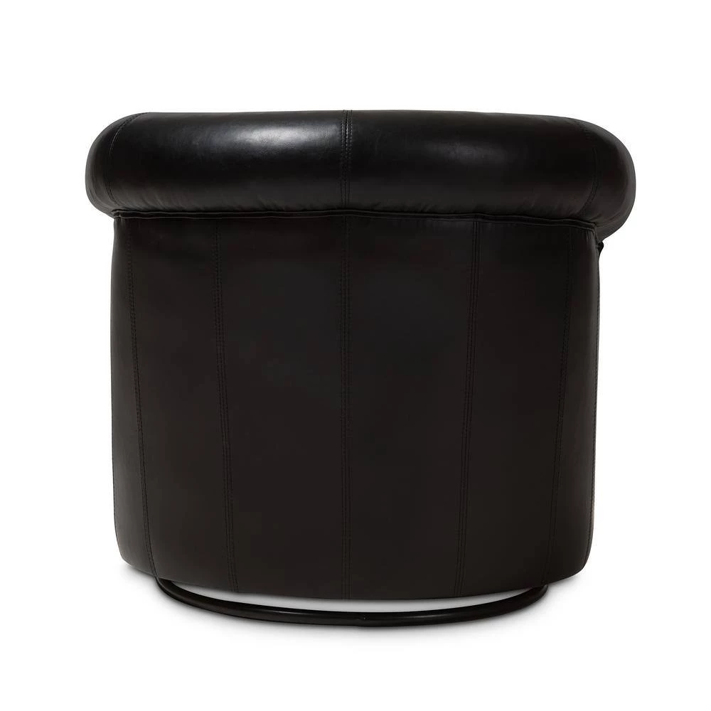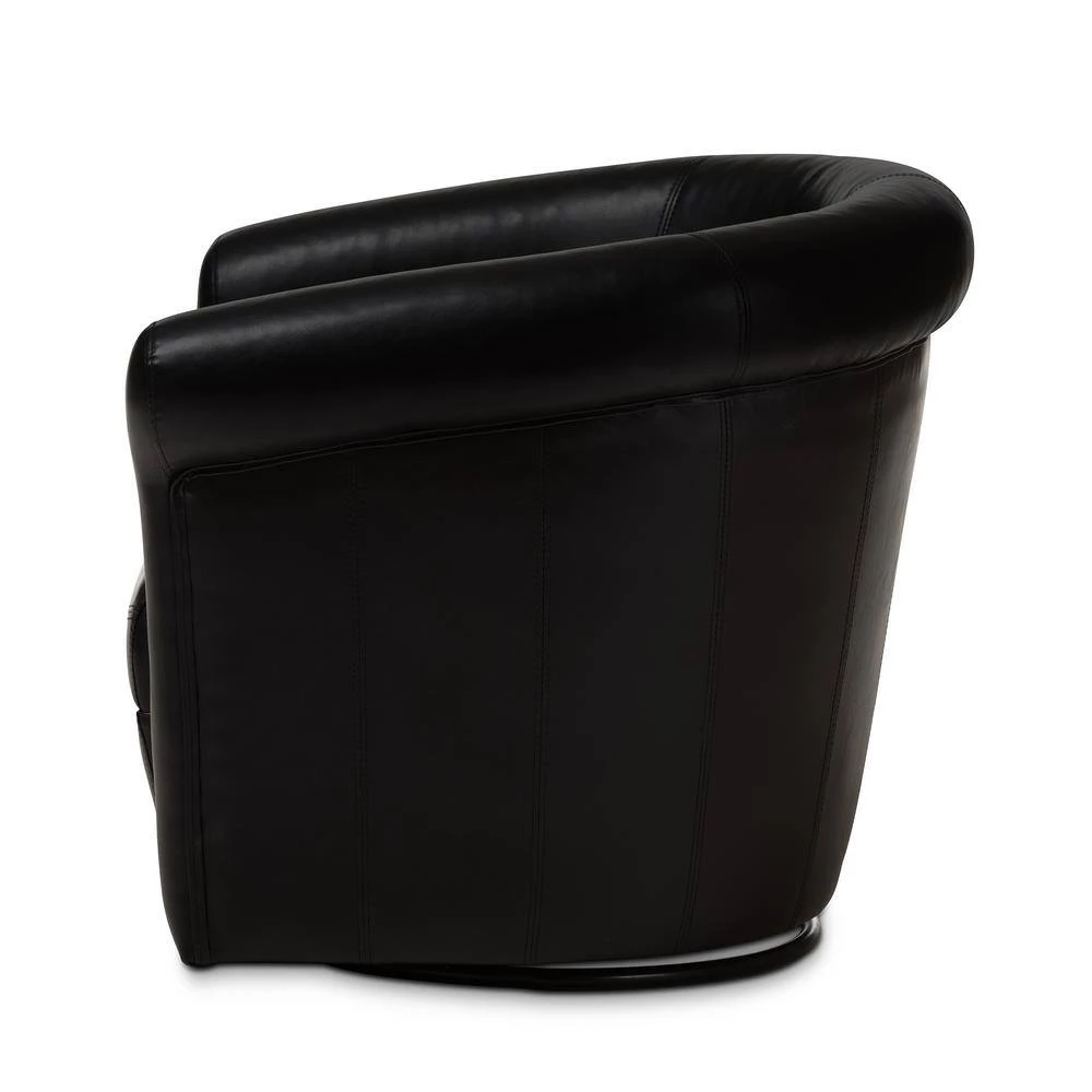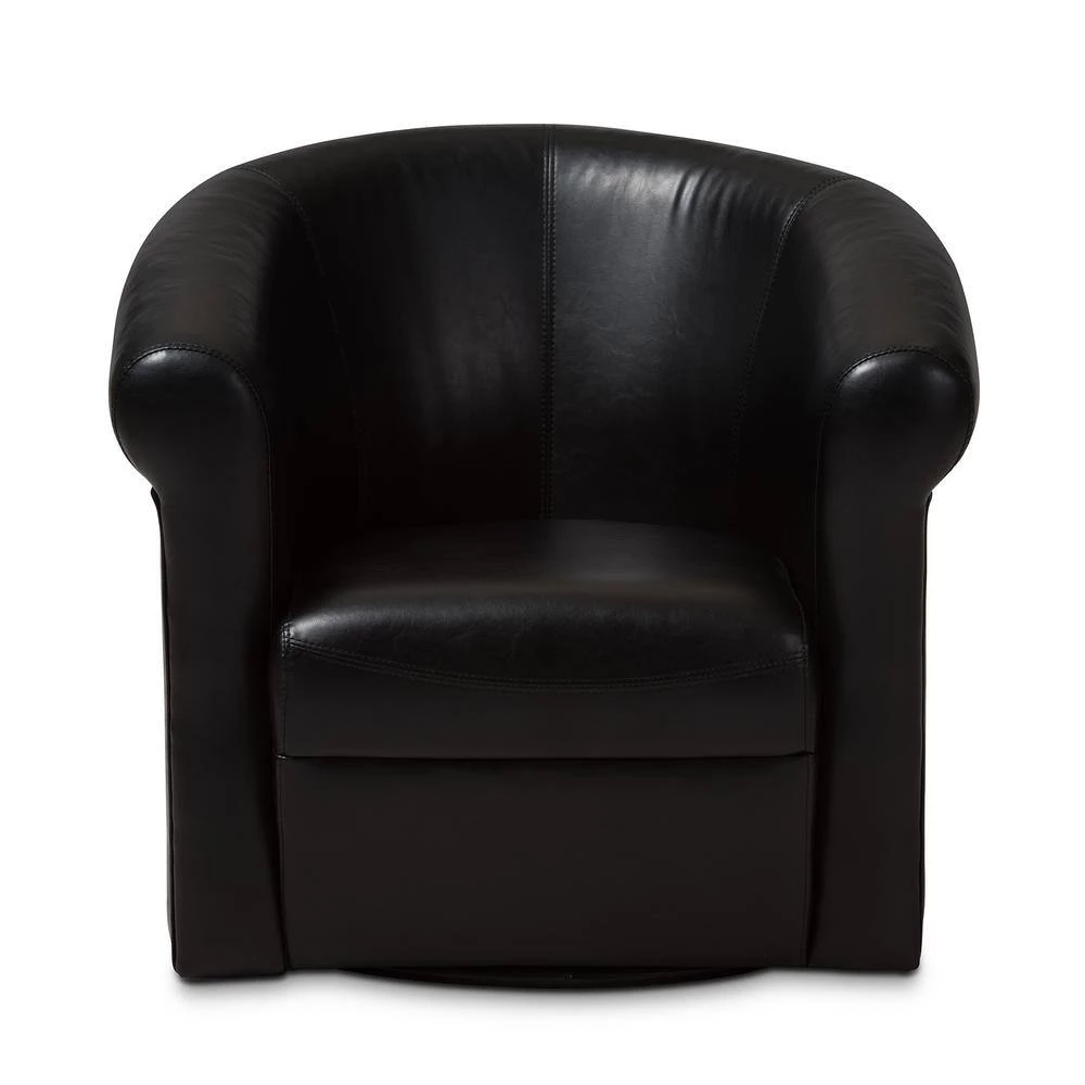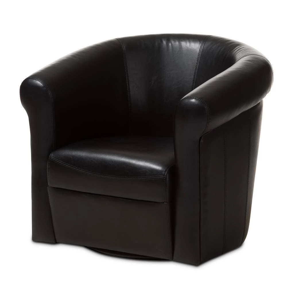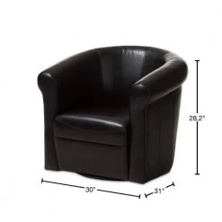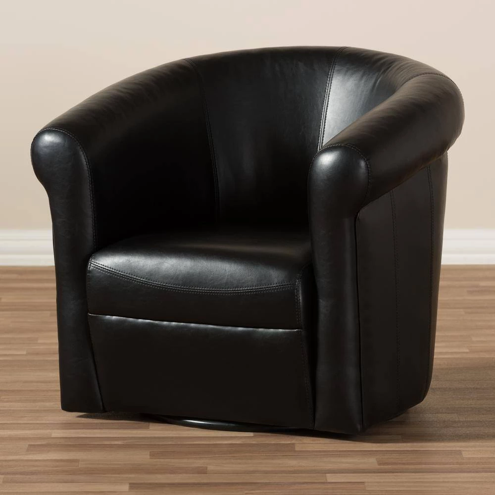 Handsome in a den, home office, or corporate setting, this black faux leather club chair is a stylish and affordable way to furnish your space. It is constructed with a frame made from plywood and MDP with dense foam cushioning and black faux leather. The circular metal base with non-marking feet allows the chair the ability to effortlessly swivel 360°. This leather club chair is fully assembled upon delivery.