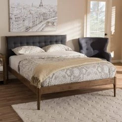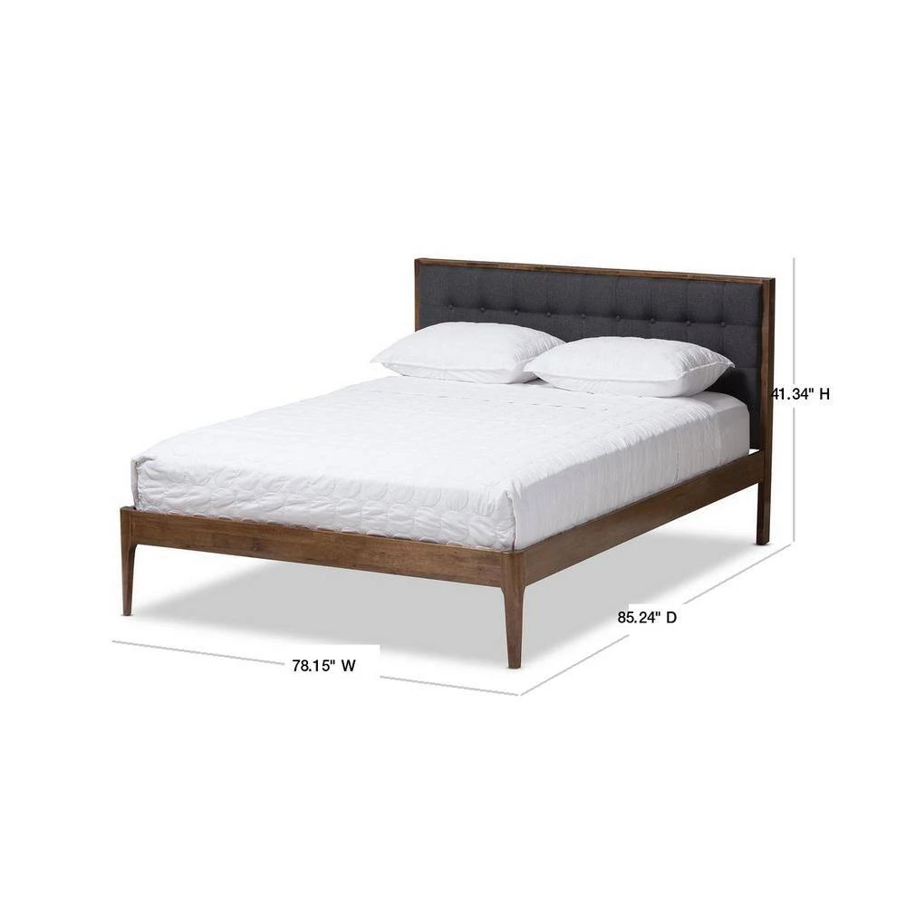 Transform your bedroom into a stylish sanctuary with the Jupiter platform bed offering a mid-century feel with a tailored fabric upholstered headboard and tapered legs. Constructed of solid rubber wood frame in walnut finishing, the Jupiter combines grey fabric upholstery for a warm and cozy comfort. Button tufted and quilted design for grandeur in the detail and added elegance to your bedroom look. The Jupiter platform bed is designed for use with a mattress only, which is supported with slat system, eliminating the need for a box spring. Available in full, queen and king sizes, this platform bed is made in Malaysia. Assembly required.