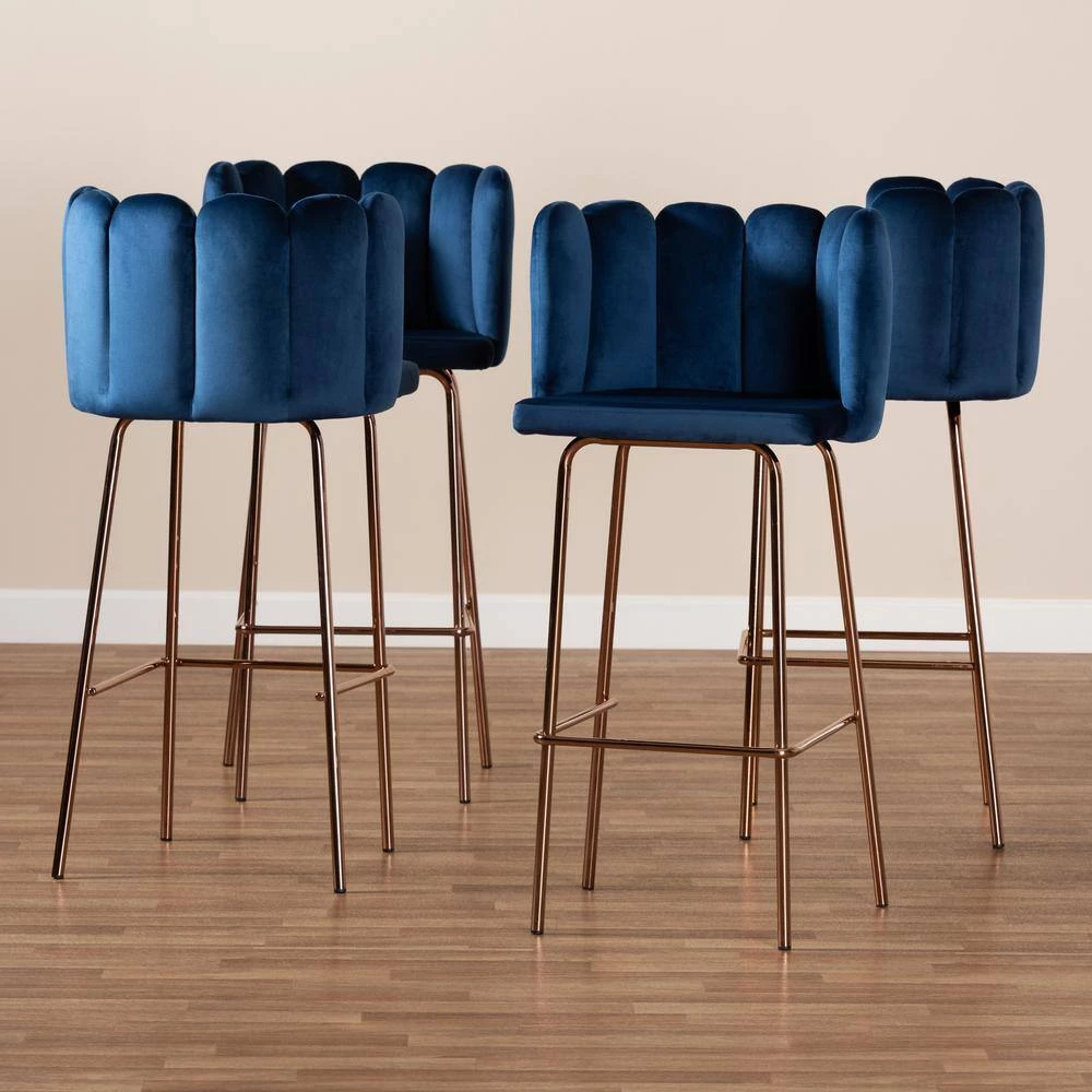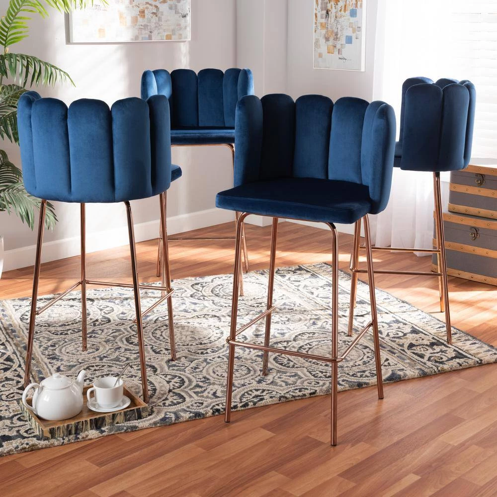 Glamorous design meets modern comfort with the Kaelin bar stool. Made in China, the Kaelin is composed of chic rose gold-finished metal legs and a smooth velvet fabric upholstered seat. Scalloped edges and channel tufting on the backrest add dimension and style, while foam padding lends plush comfort and support. Requiring assembly, the Kaelin is fitted with ergonomic footrests on three sides. The superb comfort and dazzling style of the Kaelin bar stool easily elevates the atmosphere of any home bar or lounge area.