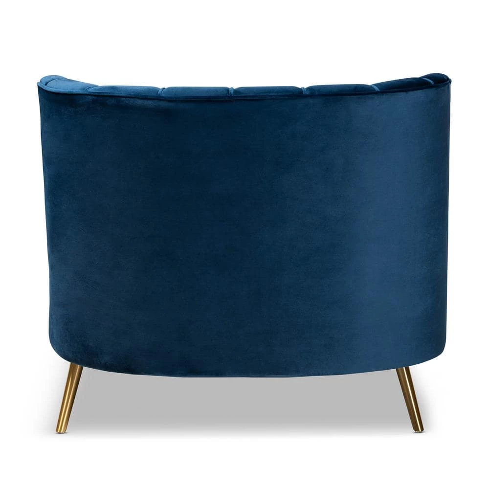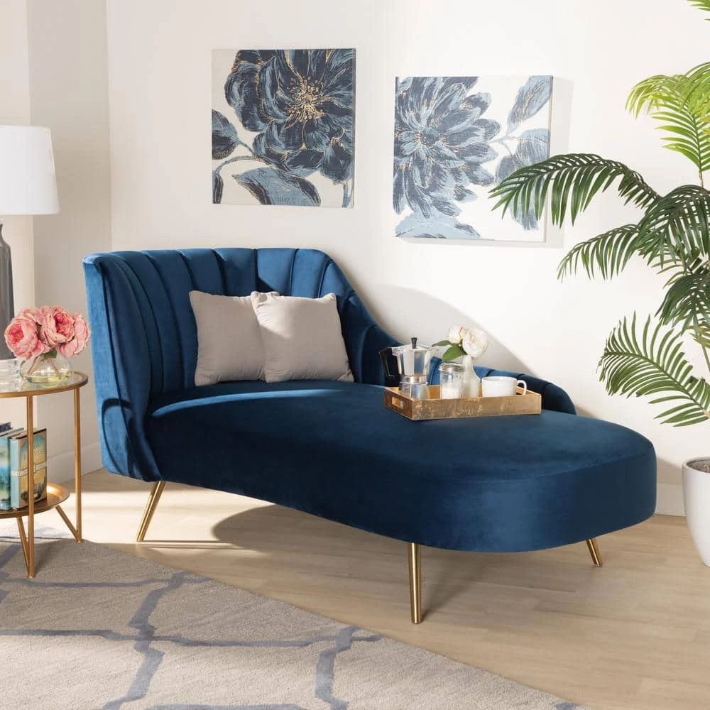 Add luxurious style and comfort to your space with the Kailyn chaise. Made in China, the Kailyn is comprised of a sturdy wood frame padded with foam and upholstered in smooth navy blue velvet fabric. The backrest extends to form a single armrest on one side and features chic channel tufting that accentuates the sheen in the velvet. Requiring assembly, the chaise is supported by splayed gold tone metal legs for an added touch of glamour. Lounge like royalty with the stunning comfort and design of the Kailyn chaise.