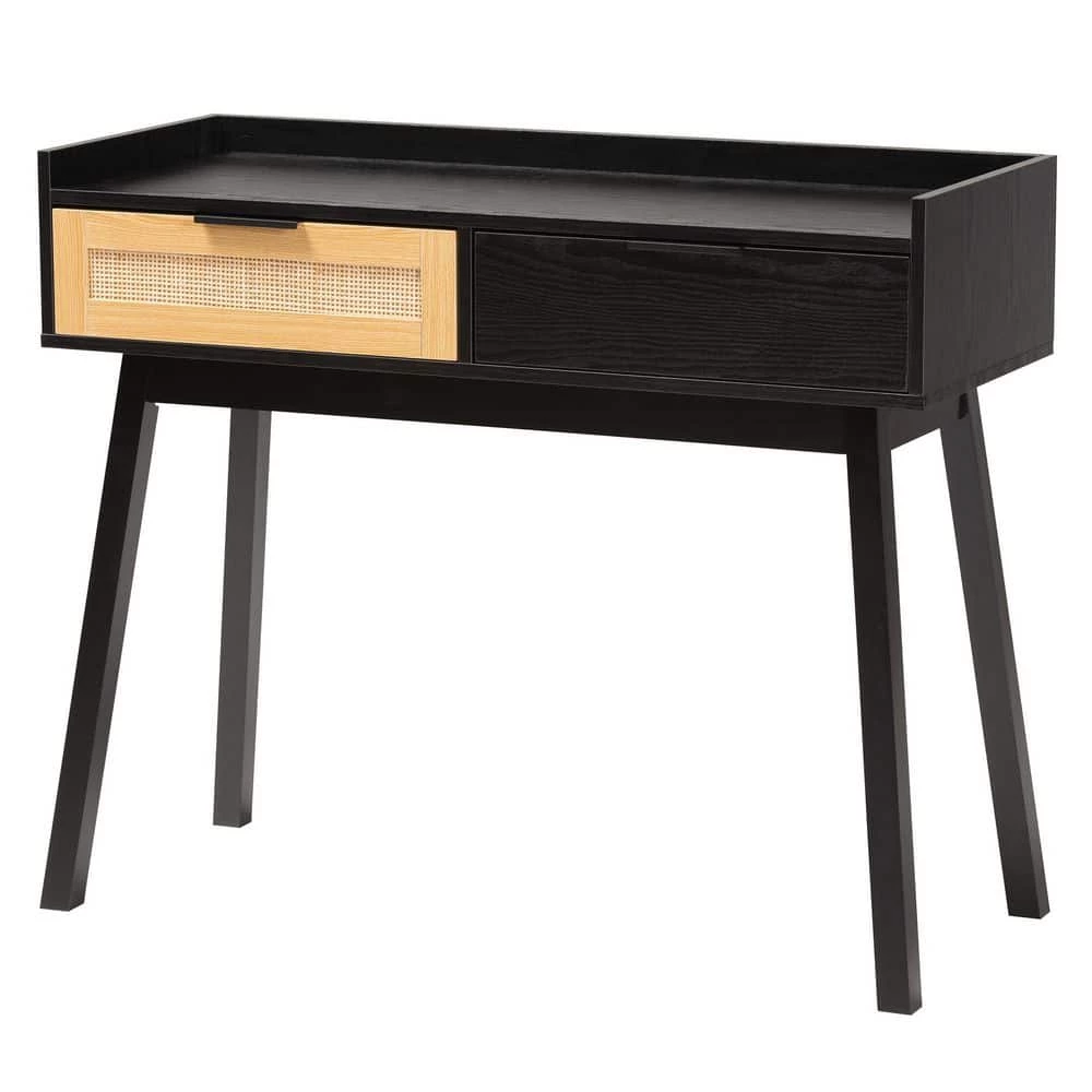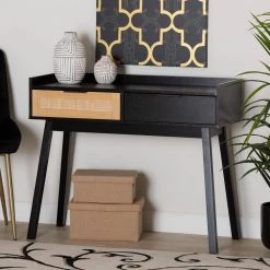 Give your interior layout a boost with the sleek design of the Kalani console table. Made in China, this handy piece consists of a solid wood frame embellished with a woven rattan drawer front. 2 drawers offer secure storage space for household essentials while reserving the wide tabletop as a fantastic display area. The Kalani requires assembly and features thin, angled legs for excellent stability and support. Striking a remarkable balance between form and function, the Kalani console table is sure to accommodate your household needs. Due to the nature of the natural materials used in this product, it may have variations in areas such as, but not limited to, color, pattern, grain and texture. The hair-like strands of rattan/rattan-fiber are common due to nature of the material.