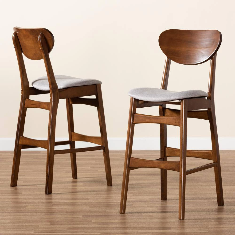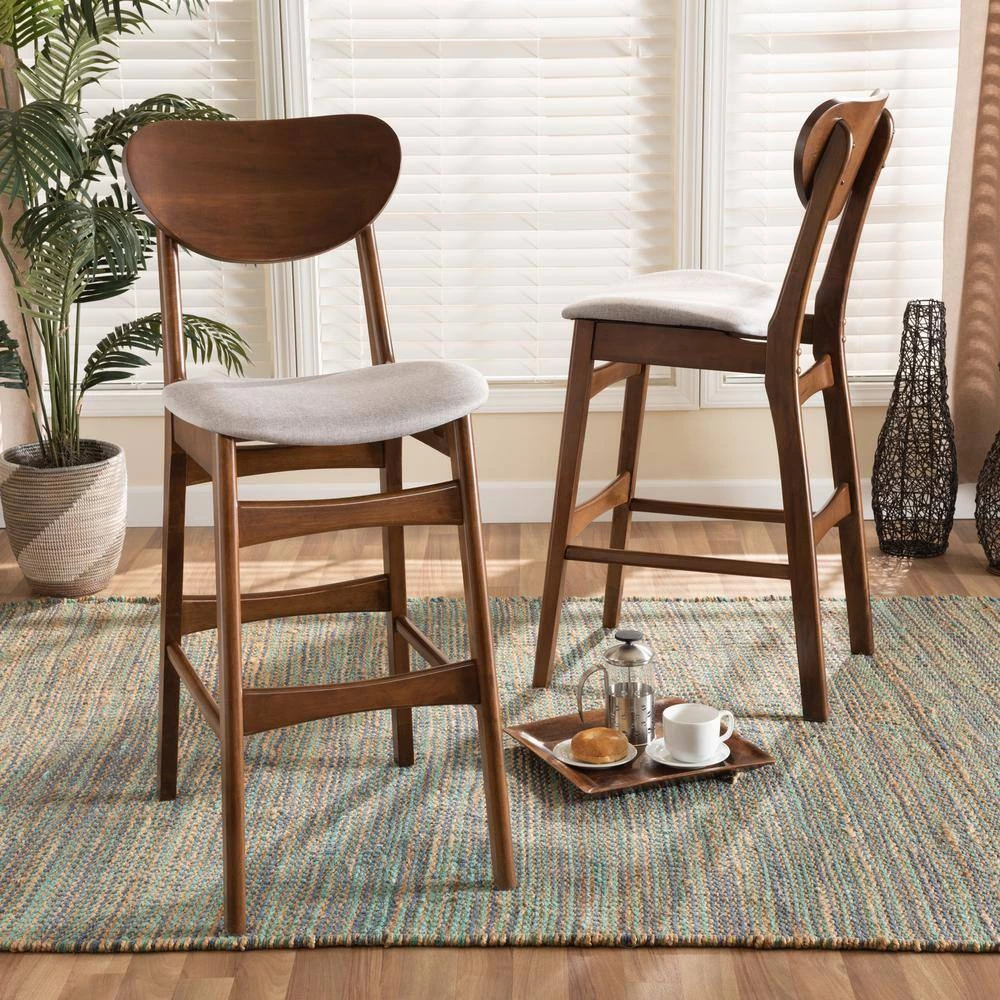 A streamlined yet comfortable design gives the Katya bar stool a charming presence. Made in Malaysia, the Katya is constructed from solid wood displaying a warm walnut brown finish. The curved backrest provides superb support while creating a distinct silhouette. Its plush, foam padded seat is upholstered in smooth fabric for ample dining comfort. Requiring assembly, the Katya features convenient footrests on each side for added comfort. Bringing comfort and style to any dining experience, the Katya bar stool is an easy addition to the modern home.
