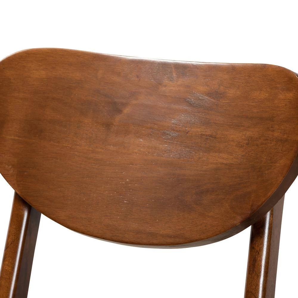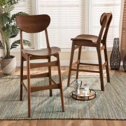 A streamlined yet comfortable design gives the Katya bar stool a charming presence. Made in Malaysia, the Katya is constructed from solid wood displaying a warm walnut brown finish. Smooth curves on the seat and backrest provide superb support while creating a distinct silhouette. Requiring assembly, the Katya features convenient footrests on each side for added comfort. Bringing comfort and style to any dining experience, the Katya bar stool is an easy addition to the modern home.