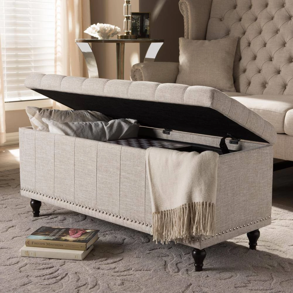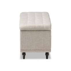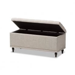 Whether paired with upholstered bed as a bed end bench or simply on its own, this modern classic button-upholstered storage ottoman offers classic and smart interiors styling with practical internal storage that will work in any room. Add an on-trend neutral accent to a simple white room, the Kaylee storage ottoman bench is upholstered in polyester fabric available in your choice of beige, greyish beige, dark grey or light blue color for a neutral or statement look. Constructed of solid rubberwood frame and feet, the Kaylee is built to last. The ottoman box opens up to reveal internal storage for blankets and bed linen. Softly padded, the top of the lid features button-tufting with grid lines while the sides are trim with silver nail heads for a modern look. For refined elegance, the detailed stitching on all sides and the classic feet complete the look. Made in Malaysia, the Kaylee storage ottoman bench requires minor legs assembly.