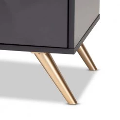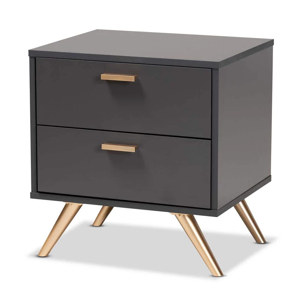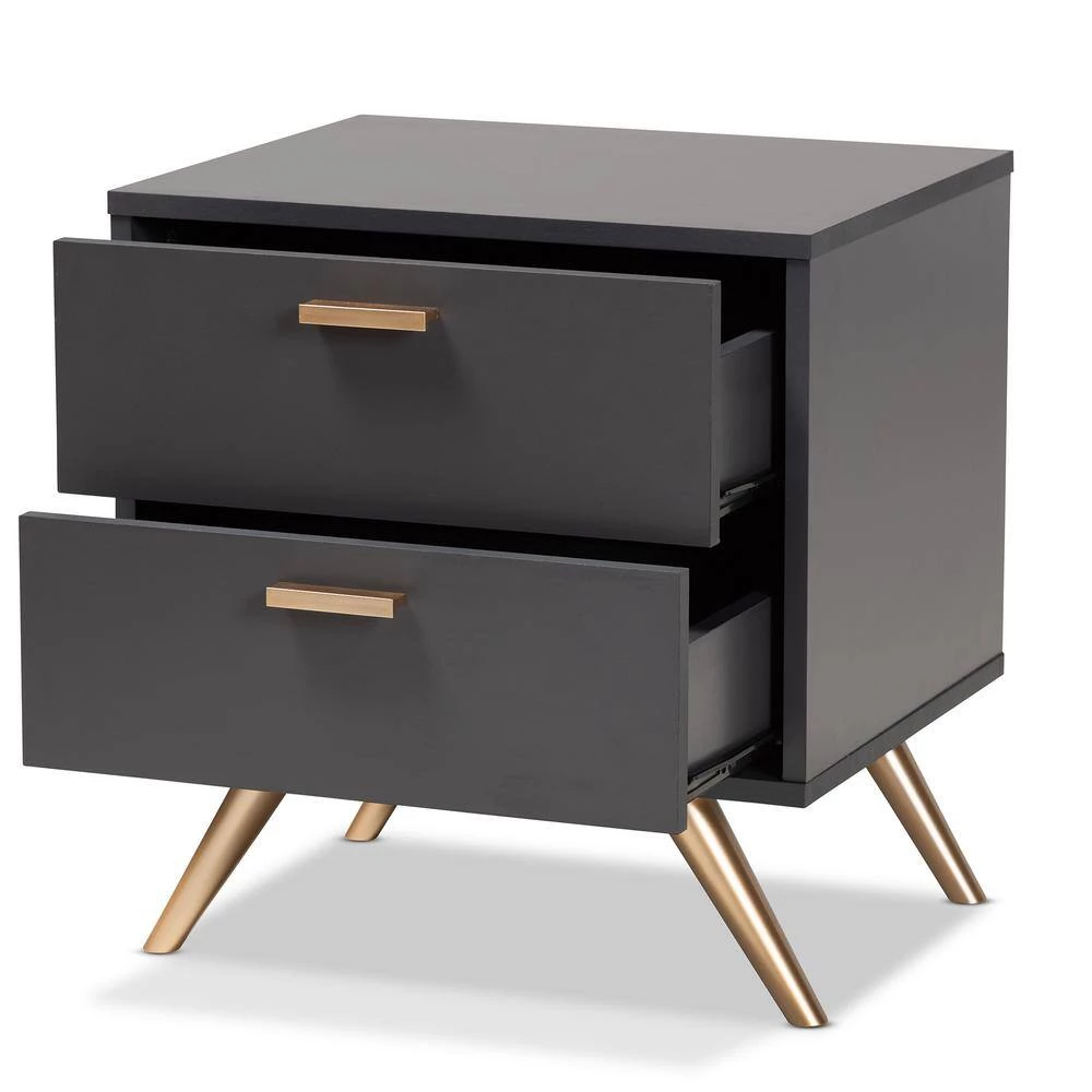 A tasteful expression of modern minimalism, the Kelson nightstand is an impressive solution to bedroom storage. Made in Malaysia, the sturdy wood frame of the Kelson showcases a dark grey finish that exudes a cool, contemporary character. 2-spacious drawers maximize bedroom space with convenient storage for all your bedside essentials. Requiring assembly, the Kelson utilizes gold-tone angled legs for stable support with a luxurious touch. Gold handles add an eye-catching touch, making the Kelson nightstand a refreshing addition to any space.