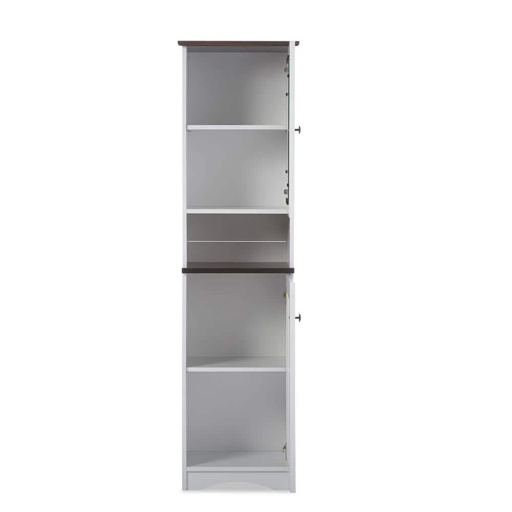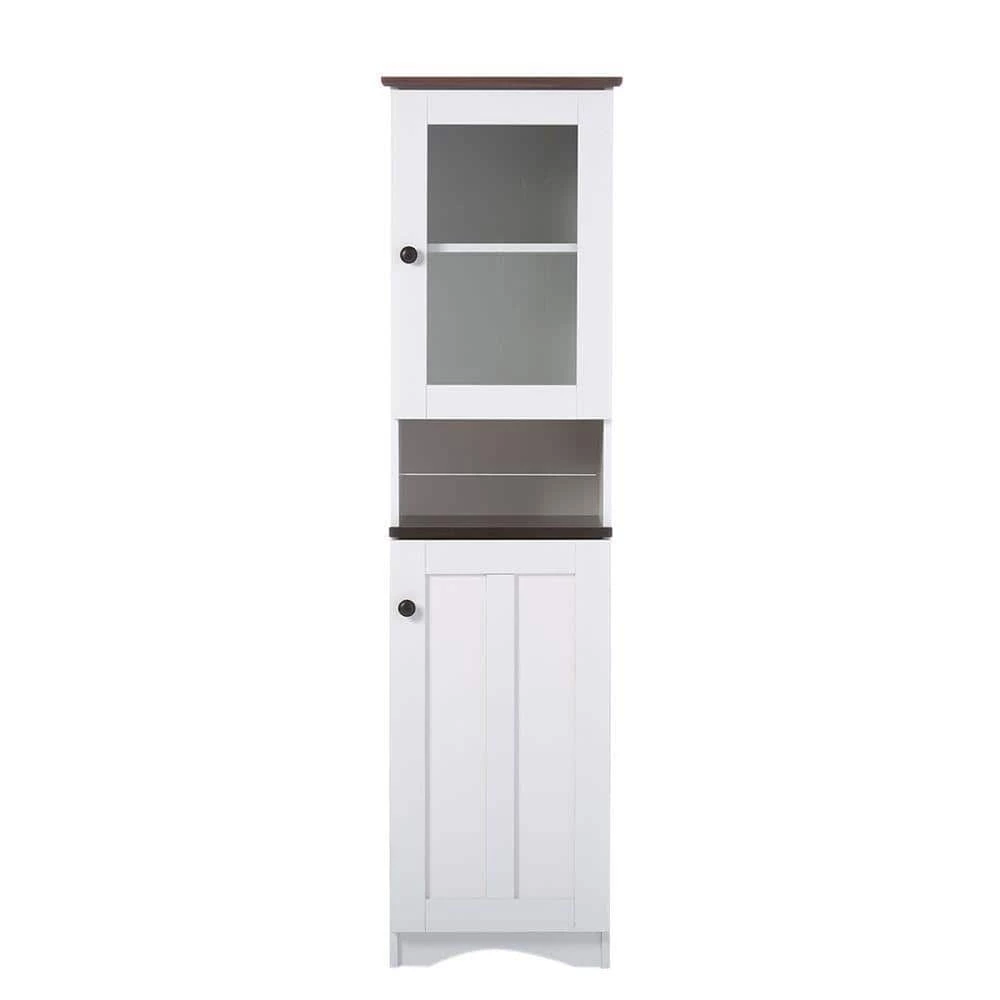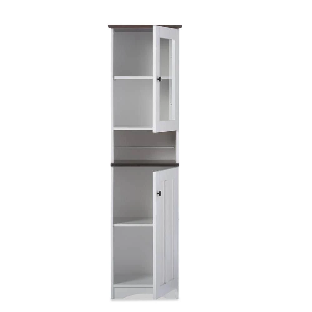 - Storage capacity: 2 upper shelves with glass door, 1 open middle shelf and 2 lower shelves with MDF door