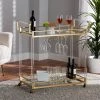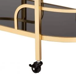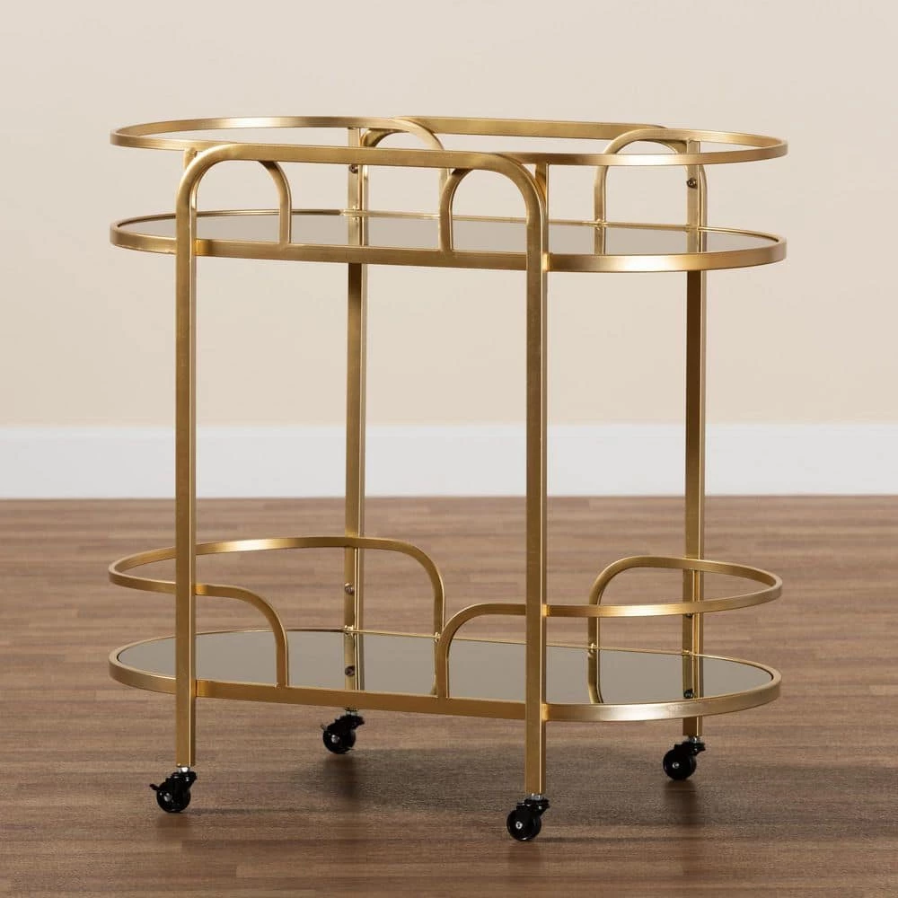 Electrify your beloved collection and astonish guests with the gorgeous opulence of the Leighton wine cart. Made in China, this remarkable piece consists of a solid metal frame fitted with tempered glass. Two oval-shaped shelves present space to display your collection or host guests while the raised borders lend a visually stunning openwork silhouette. The Leighton requires assembly and features caster wheels to easily rearrange the piece as needed. A sleek display of luxurious craftsmanship, the Leighton wine cart is sure to leave an impression.