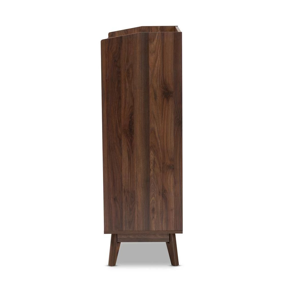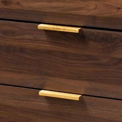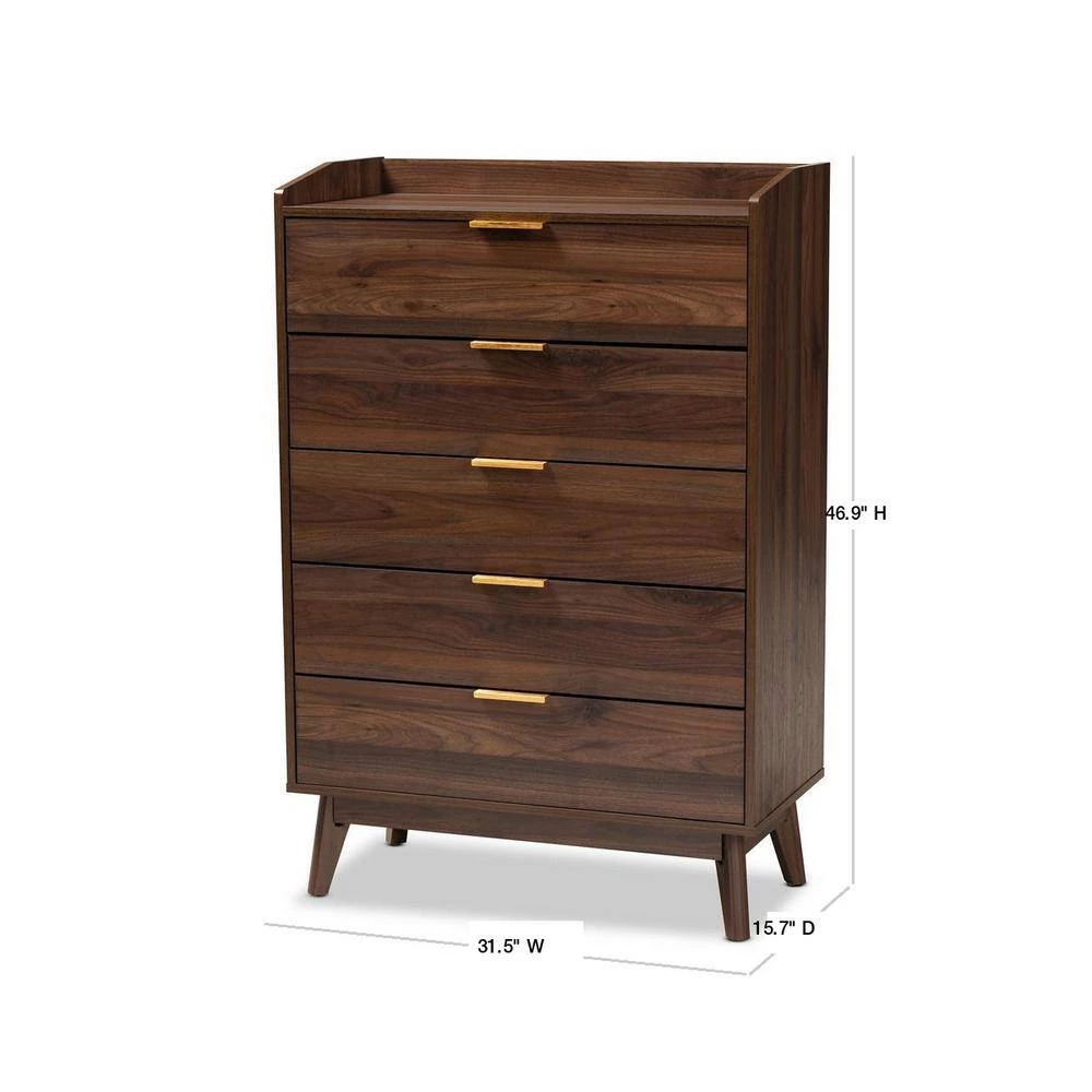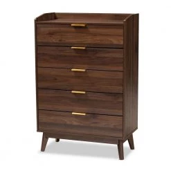 Rich wood tones are paired with a retro silhouette in the Lena chest. Constructed from engineered wood, the Lena displays an elegant walnut brown finish that complements any color scheme. Five drawers present ample space to store clothes, linens, and more. Each drawer is fitted with metal glides for smooth movement, as well as a gold-tone metal handle for a touch of refinement. Angled, tapered legs showcase the iconic mid-century look. The Lena chest is made in Malaysia and requires assembly.