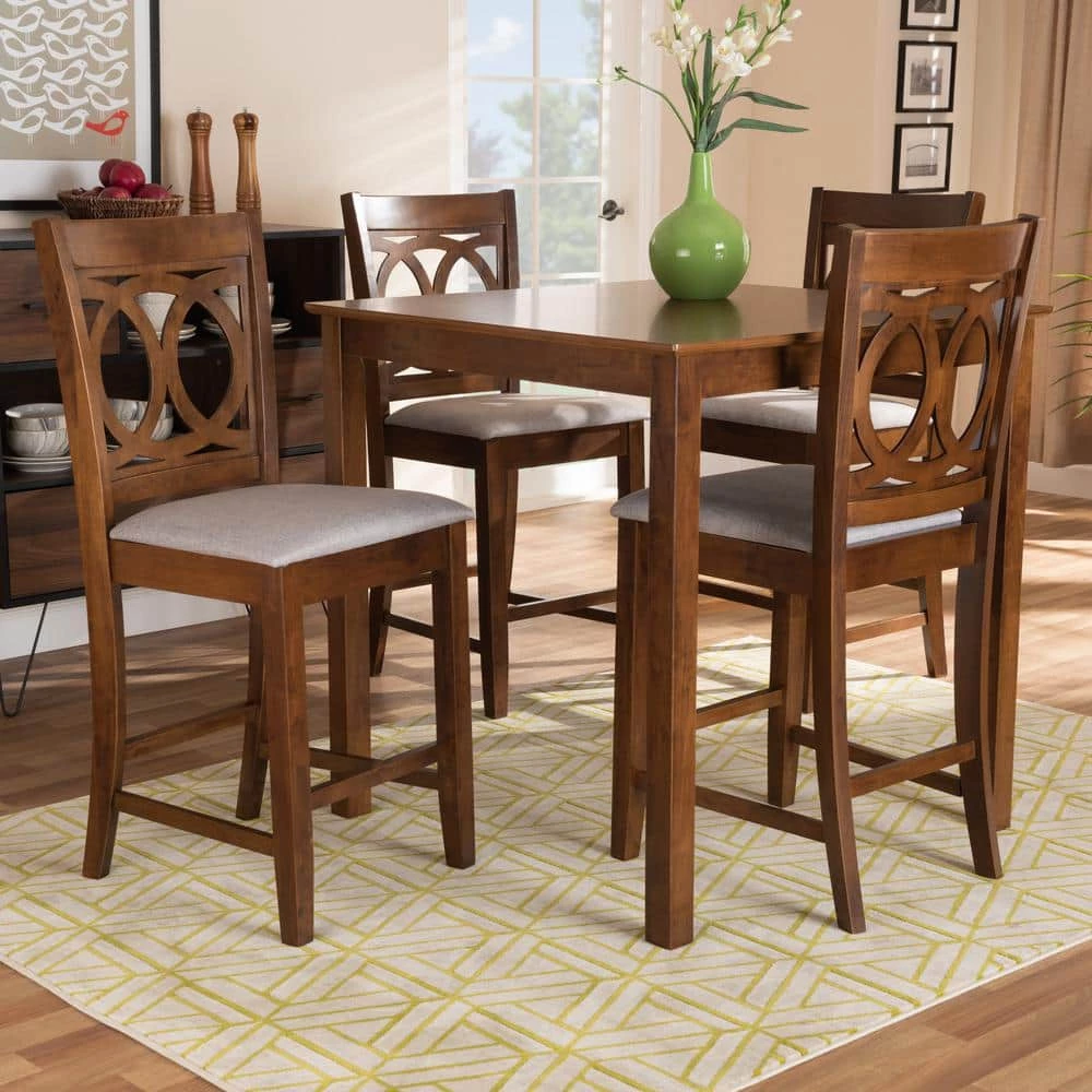 Exquisitely crafted, the Lenoir pub set adds elegance to any dining space. Made in Malaysia, this wooden pub set includes one table and four chairs, each upholstered in a light fabric that complements the walnut brown finish on the wood. Designed with both comfort and style in mind, each chair features a plush foam-padded seat, as well as an exquisite cut-out design on it’s back. Tapered feet add a classic, refined touch. Requiring assembly, this compact dining set is well suited for dining rooms and kitchens with limited space.