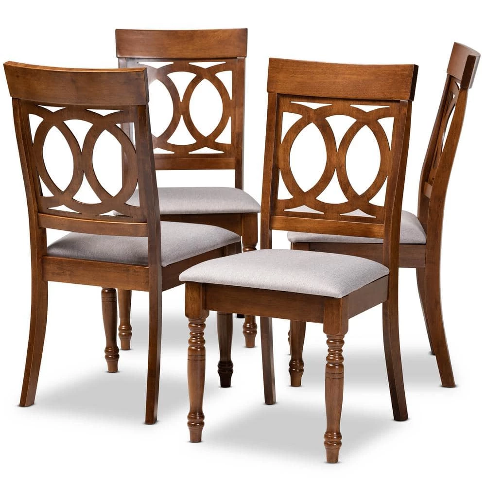 Enhance your dining space with the elegance of the Lucie dining chair. Made in Malaysia, the Lucie is constructed from solid wood and showcases a warm walnut brown finish that complements the light fabric upholstery. Designed with both comfort and style in mind, the Lucie features a plush foam-padded seat, as well as an exquisite cut-out design on its back. Turned legs add a classic, refined touch. Requiring assembly, the Lucie dining chair comes in a pack of four.