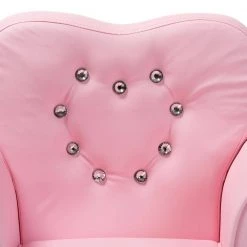 Add an adorable focal point to your little one’s space with the Mabel armchair. Constructed from rubberwood for durability, the Mabel is upholstered in pink faux leather for luxe appeal. High-density foam padding and a wide back ensure a high level of comfort during those Disney movie marathons. Faux crystal studs add a touch of glamour. This armchair is sure to become your little ones favorite spot as they read books, watch TV, and relax with friends. The Mabel armchair is made in China and requires leg assembly.