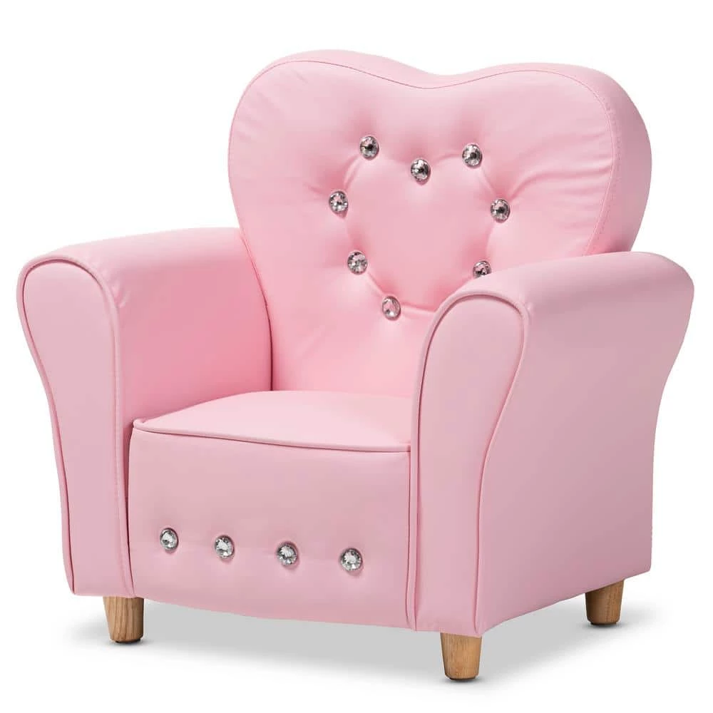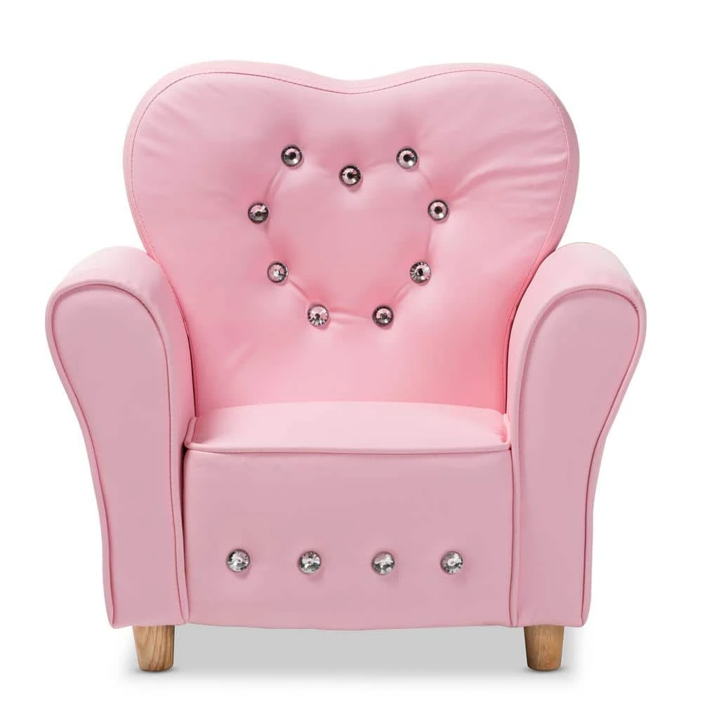 Add an adorable focal point to your little one’s space with the Mabel armchair. Constructed from rubberwood for durability, the Mabel is upholstered in pink faux leather for luxe appeal. High-density foam padding and a wide back ensure a high level of comfort during those Disney movie marathons. Faux crystal studs add a touch of glamour. This armchair is sure to become your little ones favorite spot as they read books, watch TV, and relax with friends. The Mabel armchair is made in China and requires leg assembly.