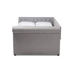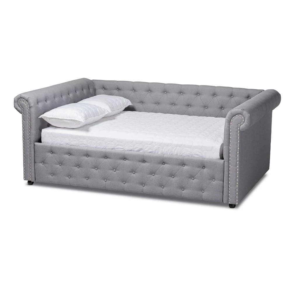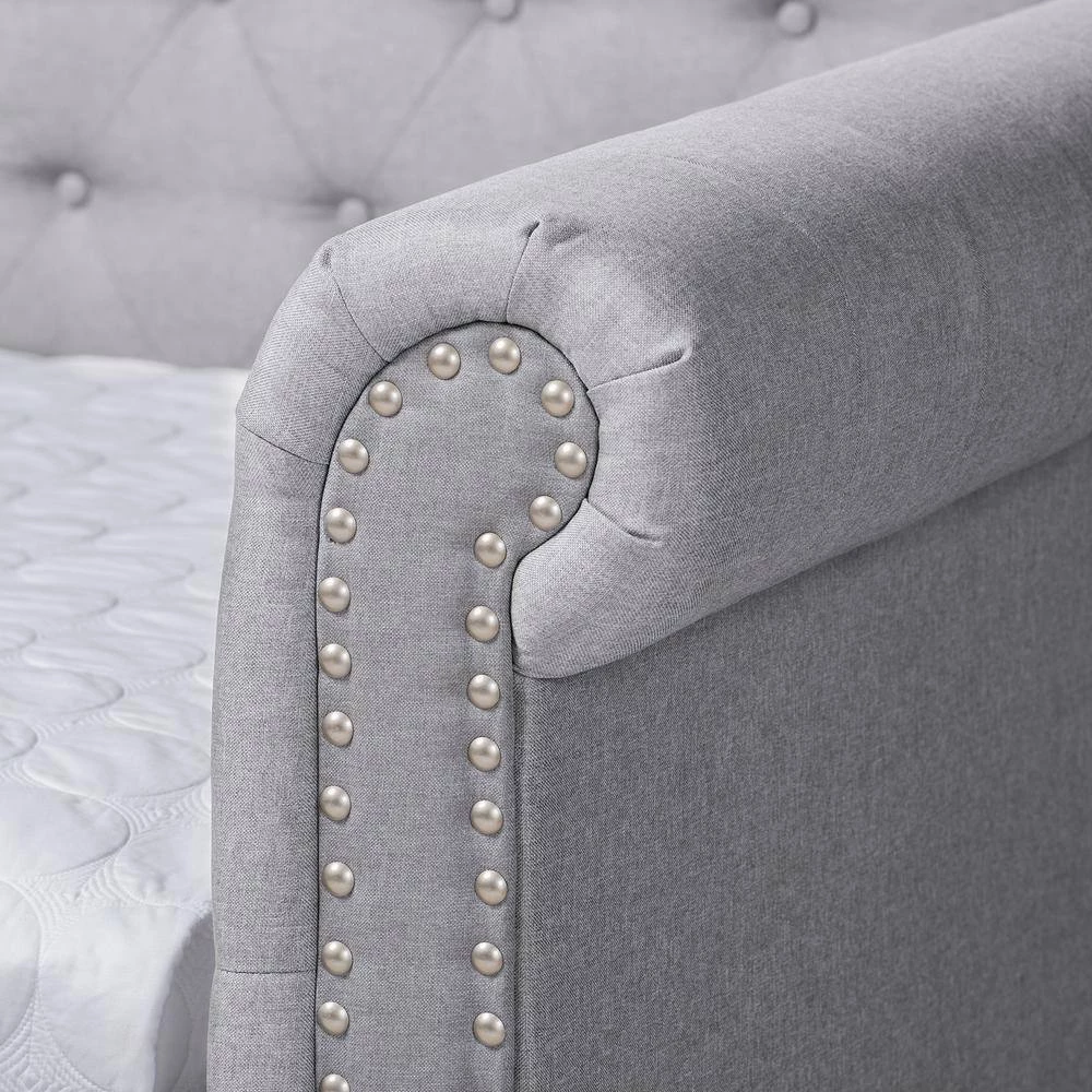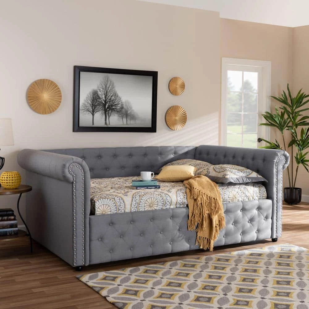 Elegant and versatile, the Mabelle daybed fuses the functions of a sofa and bed into one compact piece. Easily transform this daybed from sofa to bed with the addition of bedsheets and pillows. Constructed from solid wood and MDF wood, the Mabelle is padded with foam and upholstered in a soft linen-like polyester fabric. Silver nailheads highlight the graceful curves in the rolled arms, while button tufting adds a classic touch. Whether placed in the living room or in a bedroom, the Mabelle will allow you to maximize your space without sacrificing style. The Mabelle daybed is made in Malaysia and requires trundle assembly.
