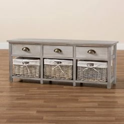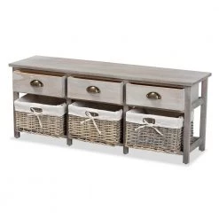 Develop your entryway with the modern convenience of the Mabyn storage bench. Made in China, this bench is comprised of a sturdy wood frame fitted with wicker baskets. Three drawers and three baskets expand the storage potential of any space while smooth metal drawer knobs adorn the bench with industrial charm. The Mabyn will arrive fully assembled and utilizes fabric liners in its baskets for a contemporary touch. A versatile addition that exudes modern charm, the Mabyn storage bench elevates the potential of any space.