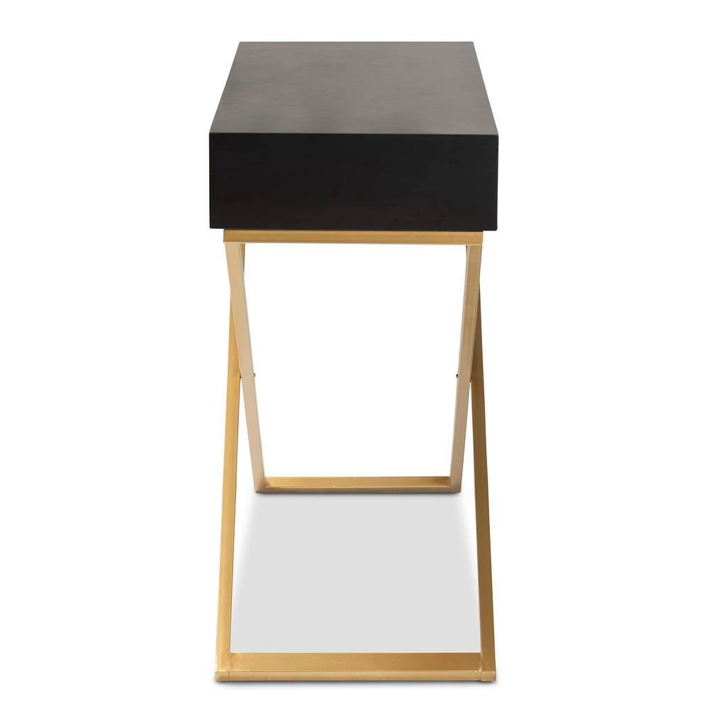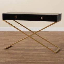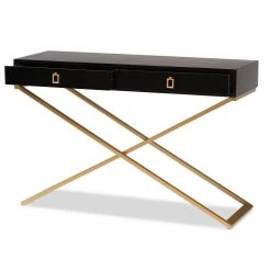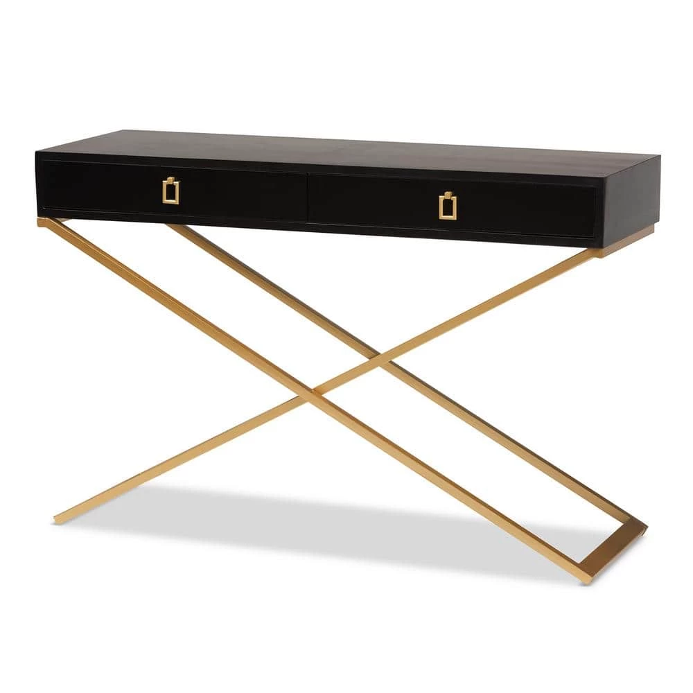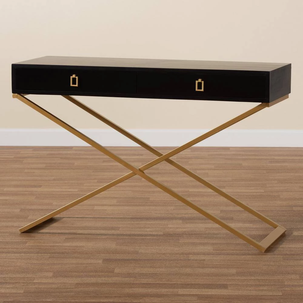 Complement the needs of your home with the lovely Madan console table. Made in China, this handy piece is comprised of a solid metal base topped with a sturdy wood tabletop. 2-large drawers offer storage space for household essentials like keys and mail. The Madan requires assembly and features square drawer pulls for an added touch of geometric charm. Crisscross legs lend a crisp silhouette, making the Madan console table an expressive yet convenient addition to any space.