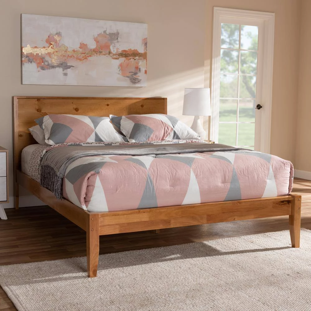 Add a fresh, breezy vibe to your bedroom with the Marana queen size platform bed. The clean lines and emphasis on wood patterns of the bed are indicative of its modern and rustic-inspired design. The sturdy solid rubber wood frame of the bed is finished in a pleasant natural oak color. The Marana feature’s a rectangular headboard with pine veneer to give your space a touch of the outdoors. The low profile footboard styling is in line with its modern look. The Marana can be easily coordinated with a wide range of looks, from contemporary to industrial styles, making it easy to freshen up your bedroom or guest room. This platform bed is designed for use with one mattress. Made in Malaysia, the Marana requires assembly.