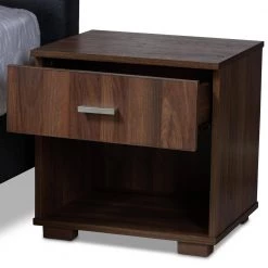 Create a stylish and cozy retreat in your bedroom with the Maren bed and nightstand set. Constructed from wood, the Maren bed is upholstered in a soft polyester fabric and padded with foam for the utmost comfort. The headboard displays chic biscuit tufting, adding texture and depth to your space. Walnut finished angled legs lend a touch of mid-century charm. The Maren bed is accompanied by two nightstands, each equipped with one drawer and one shelf to store your bedside essentials. The nightstands feature a stunning walnut finish that complements the legs of the bed, as well as a silver finished metal drawer handle. The Maren bed and nightstand are made in Malaysia and require assembly.