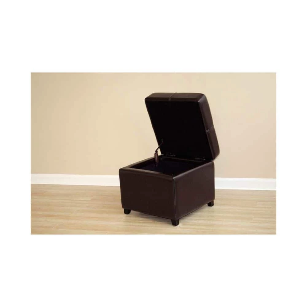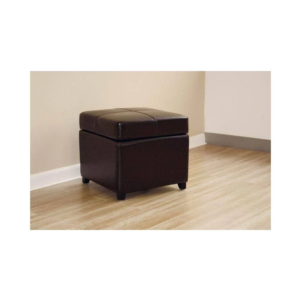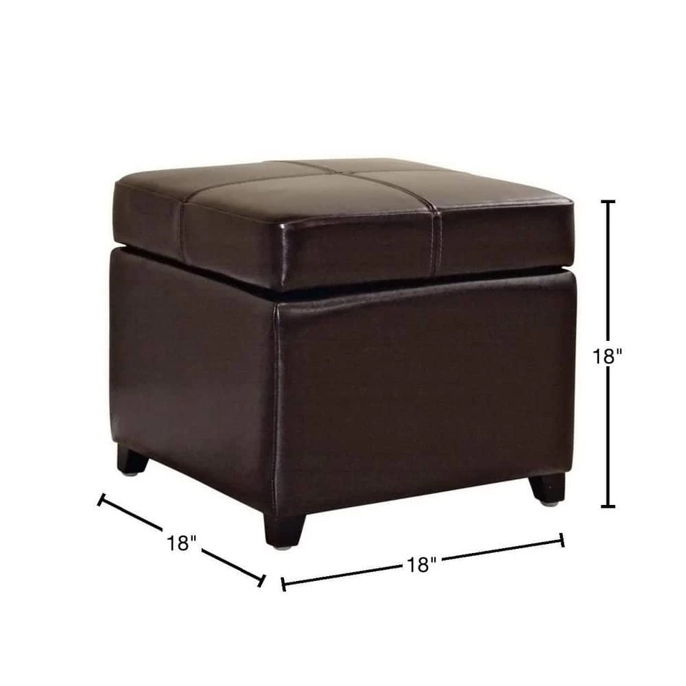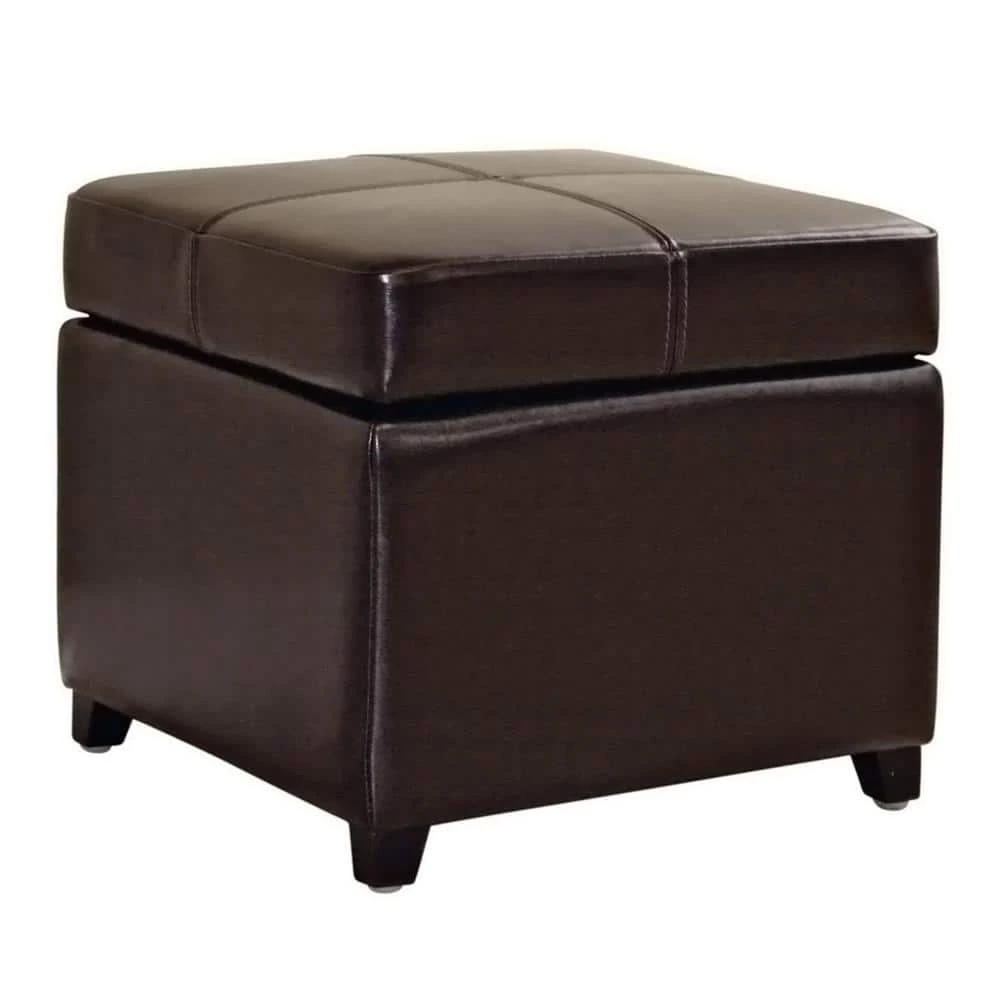 This small cube ottoman is the ultimate in versatility. The top consists of four leather panels, which are securely stitched together, forming a simple square pattern. Lift the lid to reveal ample space in which to store frequently used items, such as favorite books, remote controls, blankets and more. Little hands and fingers will be protected by the additional safety hinge.