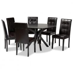 Effortlessly add style to your dining space with the exquisite Marie dining set. Made in Malaysia, the Marie set includes 6-chairs and one table. The seats and backrests of the Marie are equipped with plush, foam padded cushions underneath smooth faux leather for unmatched comfort. The circular tabletop allows ample elbow room for each member of the table, while its geometric design provides added charm. Requiring assembly, the rich color scheme of the Marie easily blends in with modern home layouts. Perfect for casual meals as well as group gatherings, the versatile Marie dining set easily upgrades any dining space.