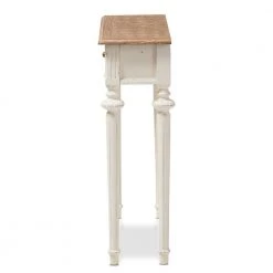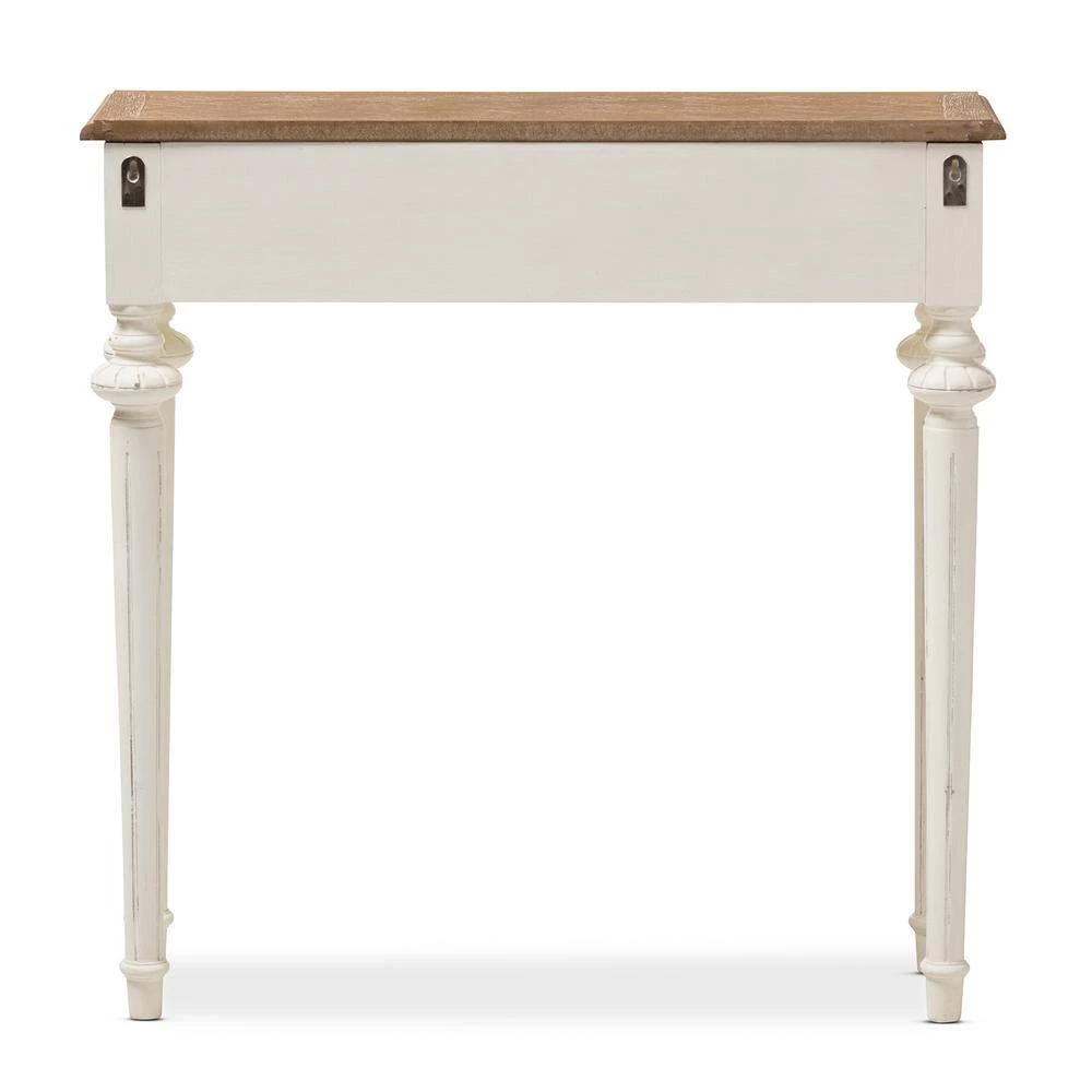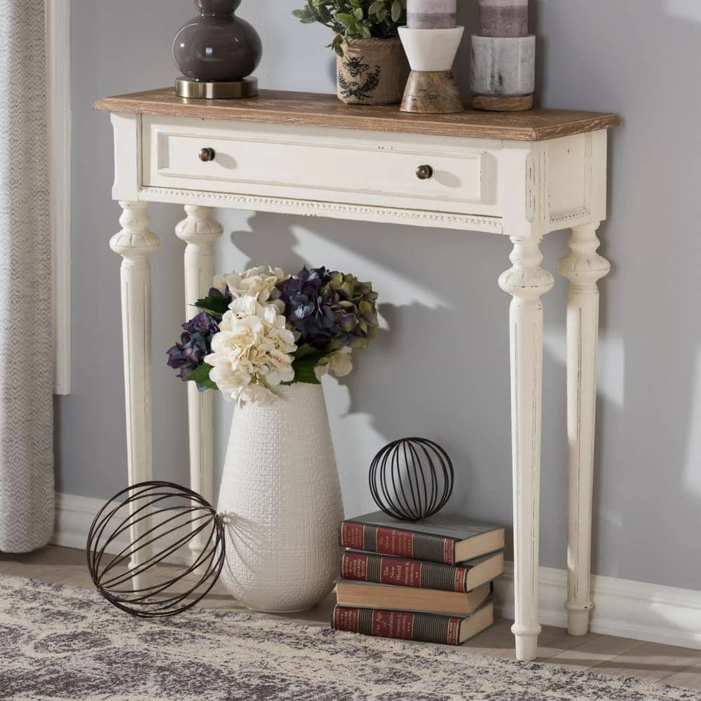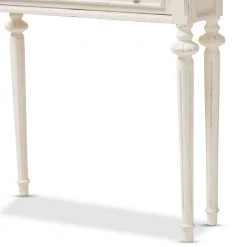 Display a sculpture, a lamp, or a favorite plant atop the French vintage Marquetterie Console Table, or use it to hold a few essentials in the bedroom or powder room. This versatile table is a useful one, yet it offers no shortage of visual details to please the eye. Carved corners and the frame details, and a fantastically distressed finish in contrasting of white and aged weathered oak add textural presence and vintage appeal. Rustic finishing of the nuts drawer pulls add classic charm to the piece of furniture. The meticulously carved French fluted legs exemplifies a refined grandeur, whilst the Mindi oak wood in whitewash textured finishing provides an inviting farmhouse feel. Classical and functional, the Marquetterie sofa table is made in Indonesia. It requires assembly.