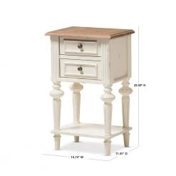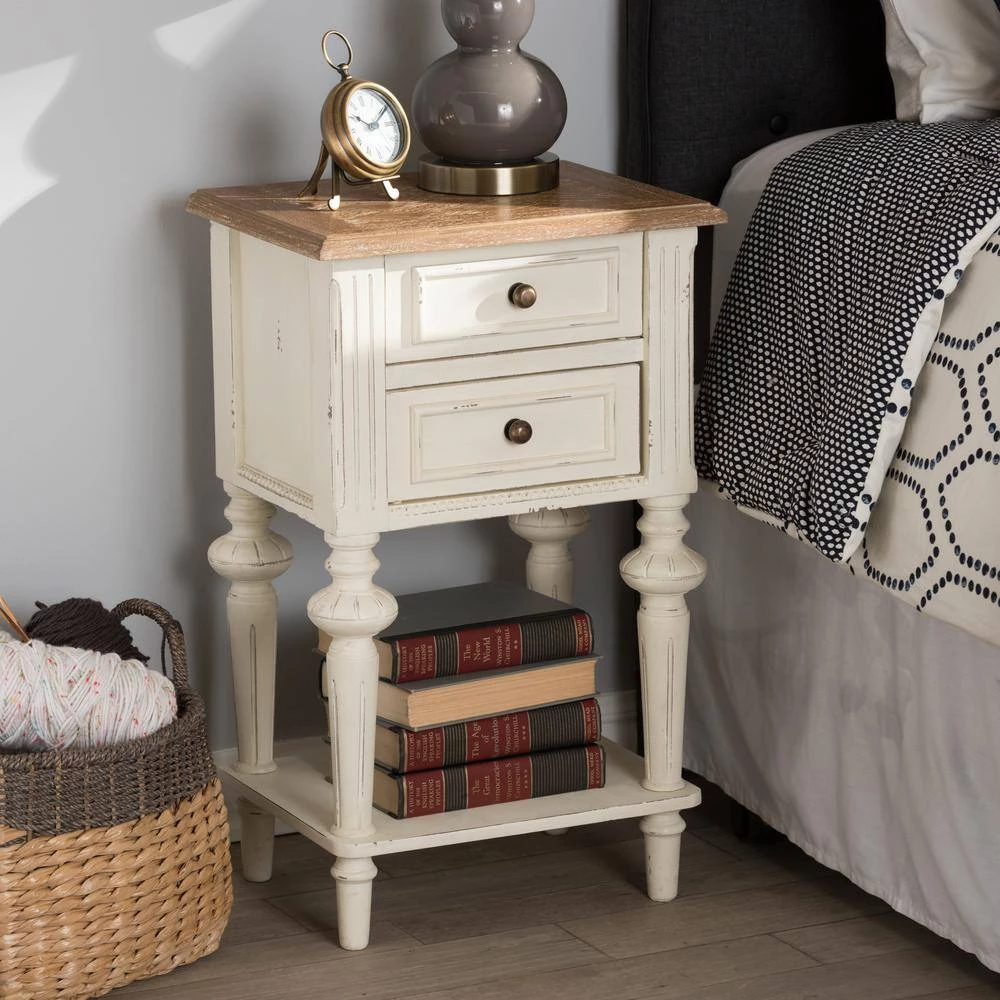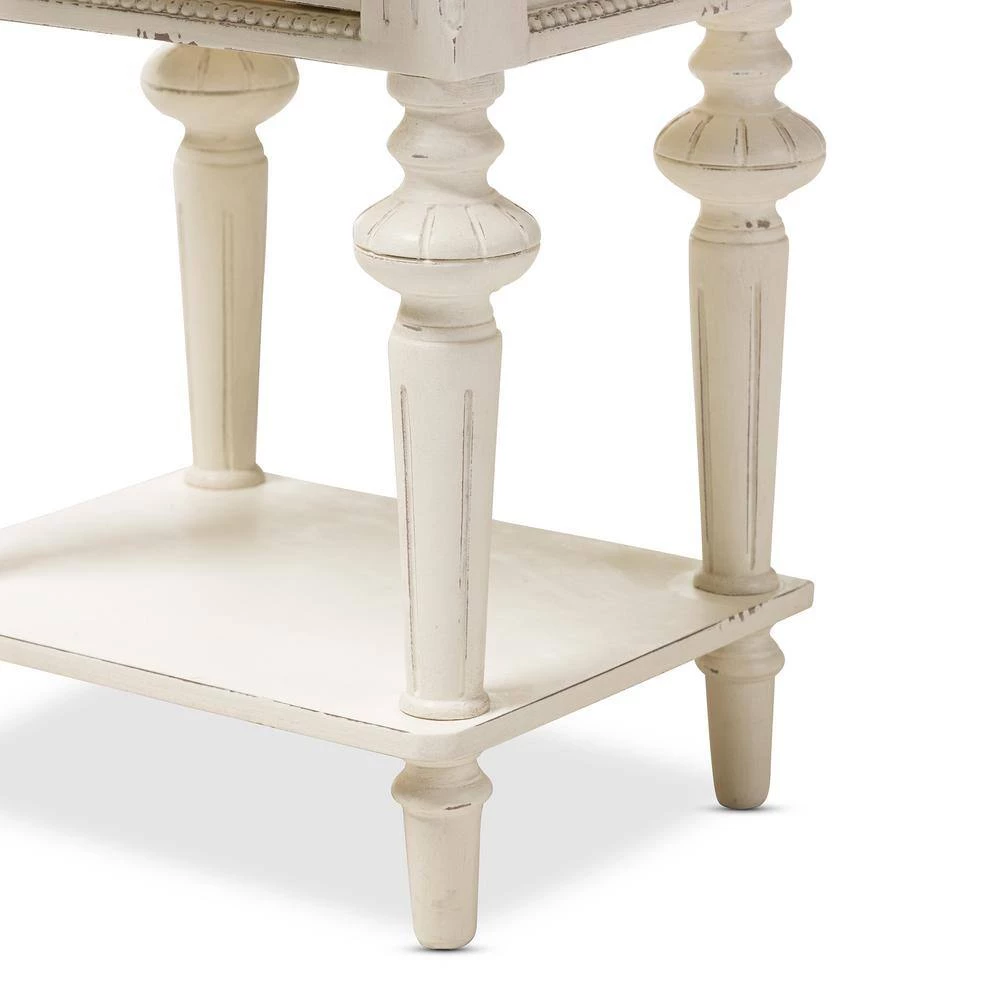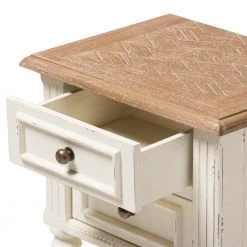 Traditional and contemporary elements work together in the Marquetterie French provincial style nightstand, giving it a timeless elegance. The gorgeous provincial design elements have been delicately restored and finished with a rustic iron handle, weathered oak wood top and distressed white polish. This bedside table with 2-drawers and 1-shelf works beautifully as a side table in the living, entry, hallway, in addition to the bedroom. The neat proportions of this bedside table make it a functional piece for smaller spaces. The meticulously carved French fluted legs and corners and the frame details are paired beautifully with a classics white distressed finish, giving a traditional style table a chic twist. Classical and functional, the Marquetterie nightstand is made in Indonesia. It requires assembly.