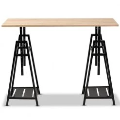 Easily update any office space with the versatile Mary desk. Made in China, the Mary is comprised of an oak-finished wooden tabletop supported by unique and ergonomic black metalwork. The height of the desk can be adjusted to fit your needs, allowing for use while sitting or standing. Requiring assembly, the Mary is fitted with one shelf on either side to store books and supplies. With a contemporary look and smart design, the Mary desk is the prime choice for any private or public office.