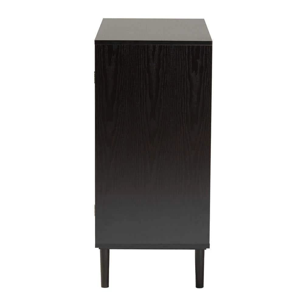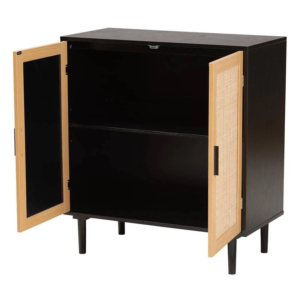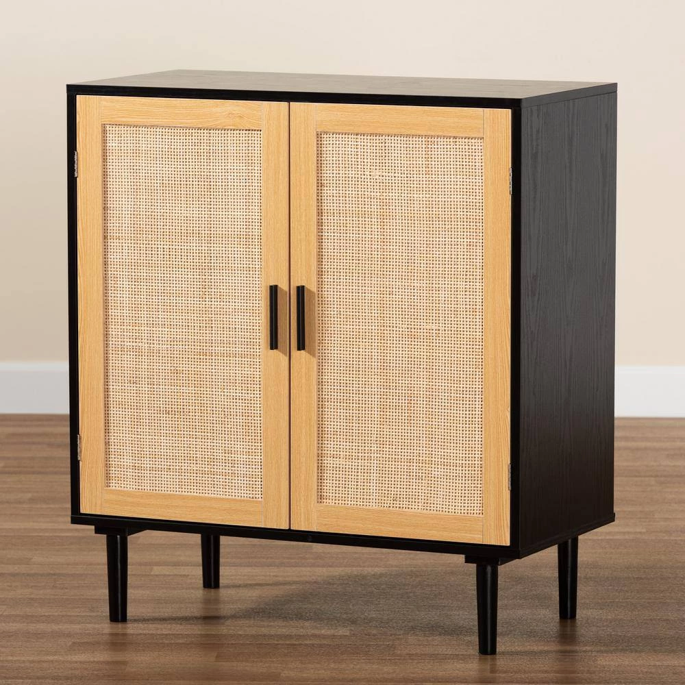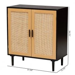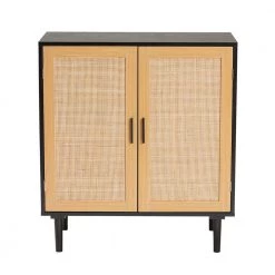 Embrace the rustic warmth of traditional craftsmanship with the lovely Maureen storage cabinet. Made in China, this bold addition is comprised of a solid wood frame adorned with woven rattan embellishments. Two spacious shelves behind the doors alleviate clutter with convenient storage for household essentials. The Maureen requires assembly and utilizes tapered legs for excellent stability and support in streamlined design. Minimalist drawer handles lend a contemporary touch, making the Maureen storage cabinet an outstanding addition to any bedroom.Due to the nature of the natural materials used in this product, it may have variations in areas such as, but not limited to, color, pattern, grain and texture. The hair-like strands of rattan/rattan-fiber are common due to nature of the material.