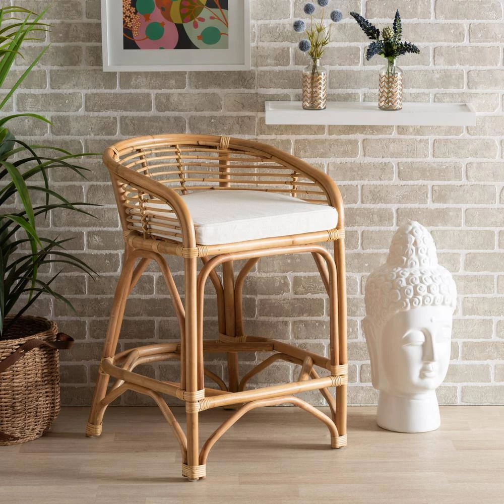 Express the carefree charm of a tropical oasis in your home with the splendid Maverick counter stool. Made in Indonesia, this stool is comprised of a natural rattan frame adorned with bamboo-like embellishments. Its seat features a cushion padded with plush foam and upholstered in smooth fabric for superb comfort. The Maverick will arrive fully assembled and features an ergonomic footrest for added comfort. Sloping armrests lend a smooth outline, making the Maverick counter stool an alluring addition to any home bar or lounge.This is a product of nature and may have variations in areas such as, but not limited to, color, pattern, grain and texture. The hair-like strands of rattan/rattan-fiber are common due to nature of the material.