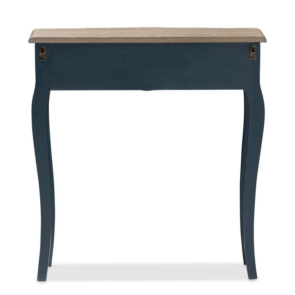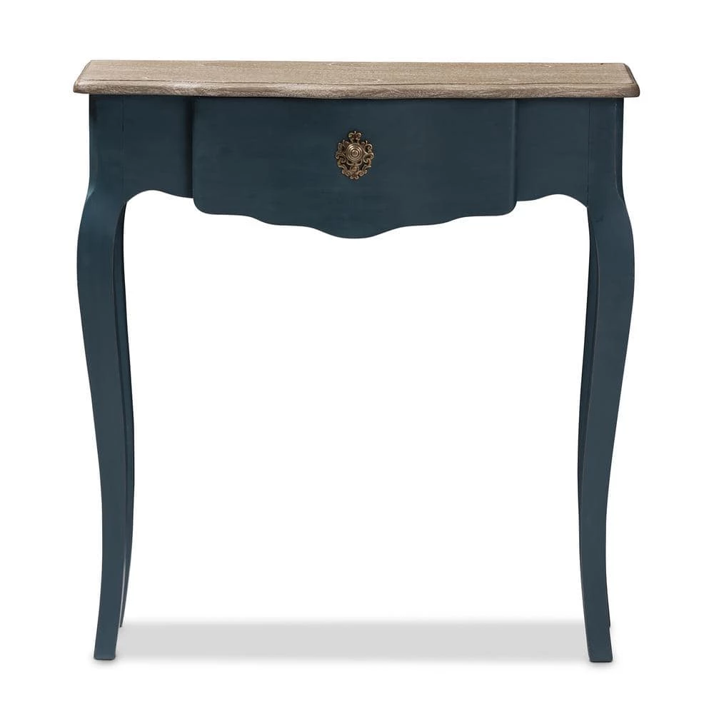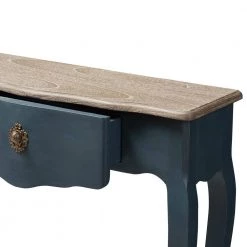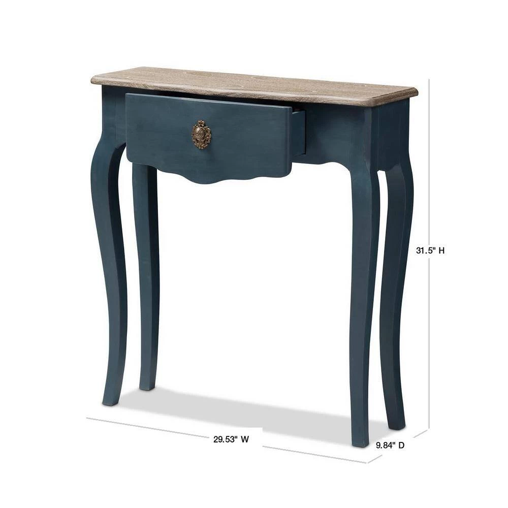 The lovely Mazarine console table will add a unique charm to your space. The classic and provincial-inspired design comes through in the greywashed table top and the graceful curves of the table’s legs. The Mazarine’s most stunning feature is its blue spruce finishing. The table’s drawer face has a scalloped edge, evocative of farmhouse and French-style decor. The metal drawer knob of the Mazarine features an ornate design and gold finishing. Add elegance to your entryway or hallways with this breath-taking console table. Made in Indonesia, the table requires assembly.