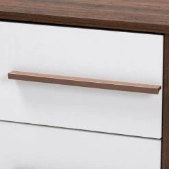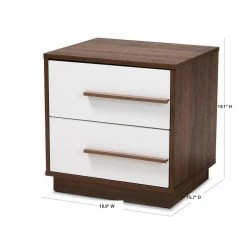 With its sleek design and exceptional craftsmanship, the Mette nightstand is a stylish addition to any bedroom. Constructed from engineered wood, the Mette showcases a two-tone white and walnut brown finish for a cool, contemporary feel. Two drawers provide ample space to store bedside necessities. Each drawer is fitted with metal glides for smooth movement. Elongated PVC handles complete the clean, streamlined look of this nightstand. The Mette nightstand is made in Malaysia and requires assembly.