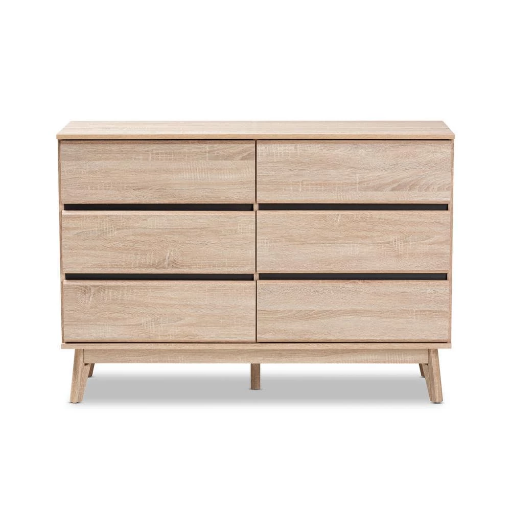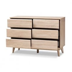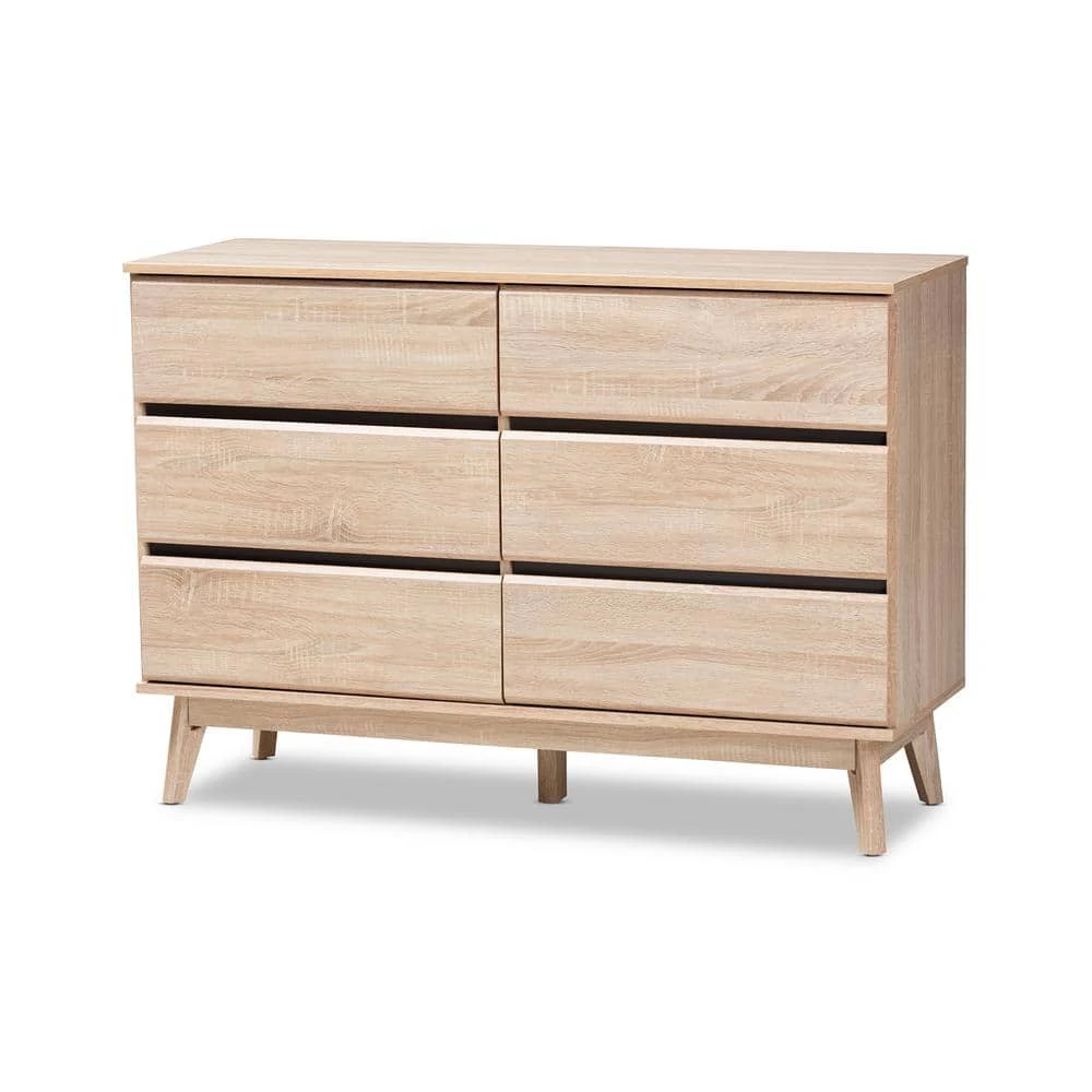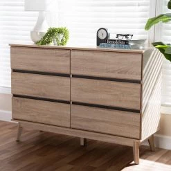 The simplicity and minimalist look of the Miren 6-drawer dresser make it a seamless addition to your bedroom or guest room. The sleek silhouette and angled, tapered legs of the dresser are hallmarks of its mid-century modern-inspired design. The Miren features an engineered wood frame finished in a light oak brown, with dark grey finishing between the drawers for a subtly contrasting color scheme. The dresser’s five drawers pull forward from the top on sliders. The Miren’s simple-yet-chic look make it easy to coordinate with your existing decor. The under-clearance area beneath the dresser make it easier to clean underneath it. Made in Malaysia, the Miren requires assembly.
