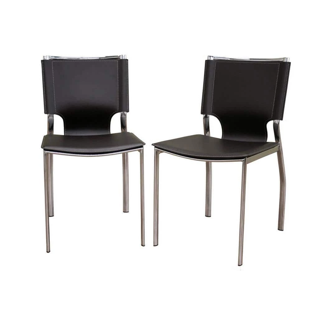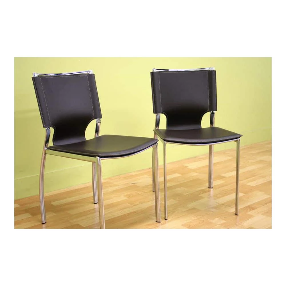 The shine of the chrome-finished steel frame contrasts beautifully with the matte brown bonded leather of the seat. The edges of the leather are finished with a single line of stitching in light beige. Small black plastic non-marking feet are included to protect your floor. Made in China.