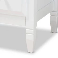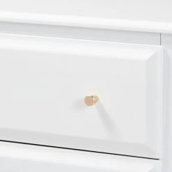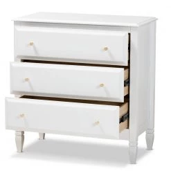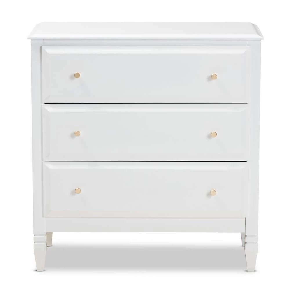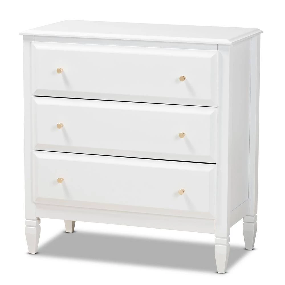 A classic silhouette receives a glamorous update in the Naomi chest. Made in Malaysia, this wooden chest displays a polished white finish that brightens any space. The tabletop is well suited for a lamp and trinkets, while 3-drawers provide ample storage space for clothing and linens. Each drawer is adorned with a striking gold-tone knob that adds a touch of glamour. Inspired by traditional design, the Naomi features tapered feet with recessed detailing. Requiring assembly, the Naomi chest strikes the optimal balance between classic and contemporary for a look that enhances any bedroom.