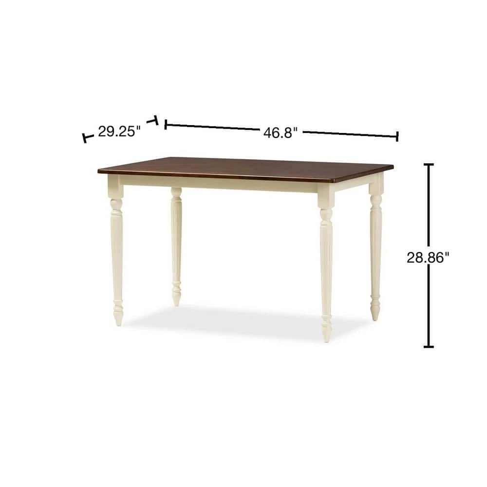 This attractive dining table features antiqued cherry top and creamy buttermilk paint finished base for a casual, vintage-inspired look. Sure to look beautiful in any home, this dining table is ideal for country cottages and modern townhouses alike. Expertly crafted from solid rubberwood, the Napoleon Dining Table features a solid cherry top supported by four detailed turning legs. Two-tone finishing and elegant ball design, this timeless collection is ideal for inviting friends over. Designed to seat four to six guests, the Napoleon is suitable as kitchen breakfast table or a casual dining table. Made in Malaysia, the Napoleon requires assembly.