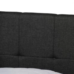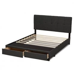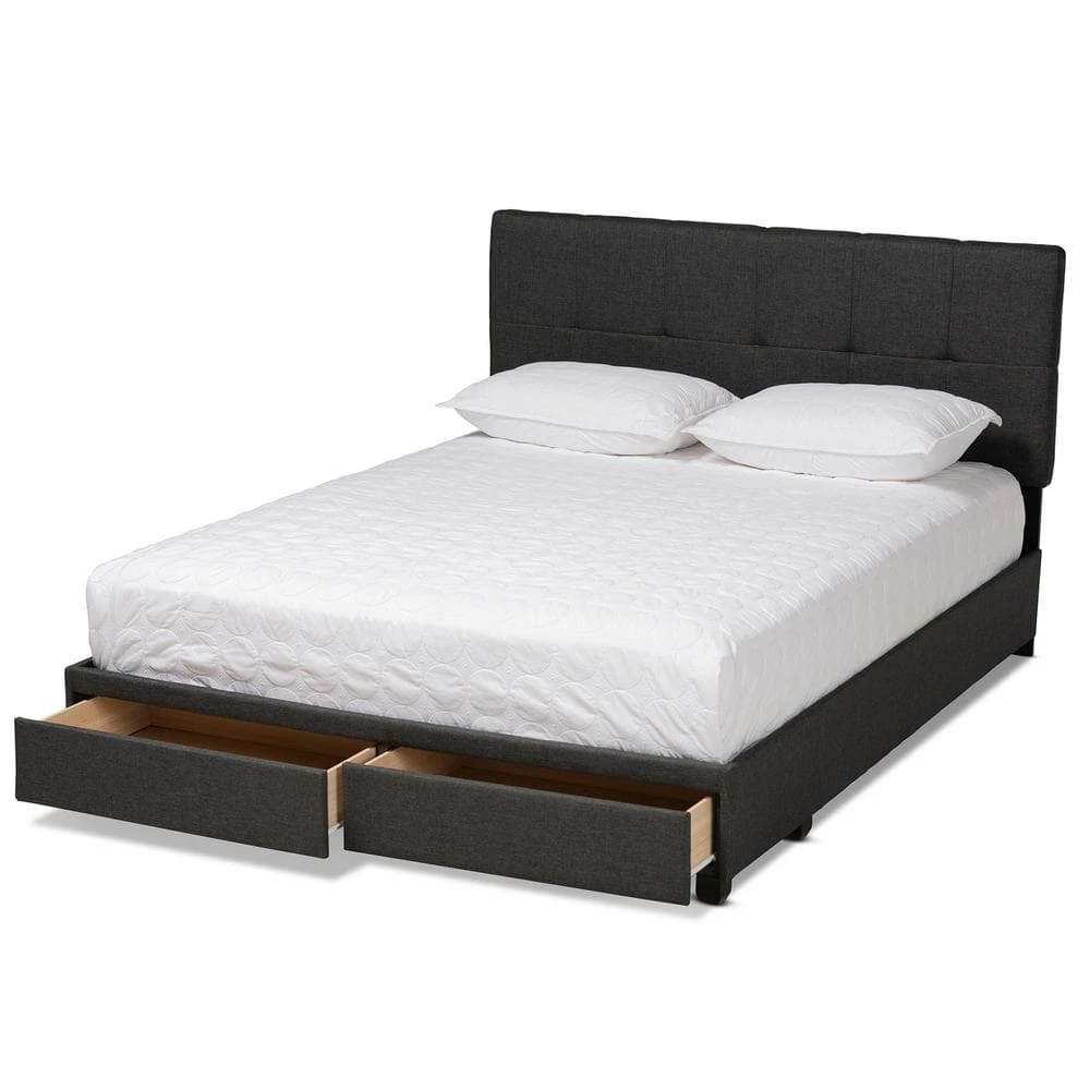 Reinvent your bedroom with the modern elegance of the Netti bed. This chic bed is upholstered in an elegant linen-like fabric that provides ample comfort for you to lean against as you read or watch TV. Biscuit tufting and black feet lend a clean, contemporary look. Stylish and practical, the Netti is fitted with two drawers at the footboard with space to store clothes, sheets, and more. The Netti bed is made in Malaysia and requires assembly.