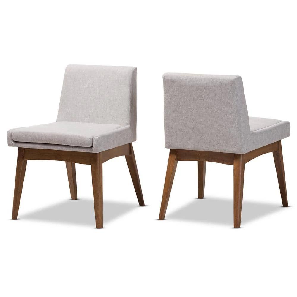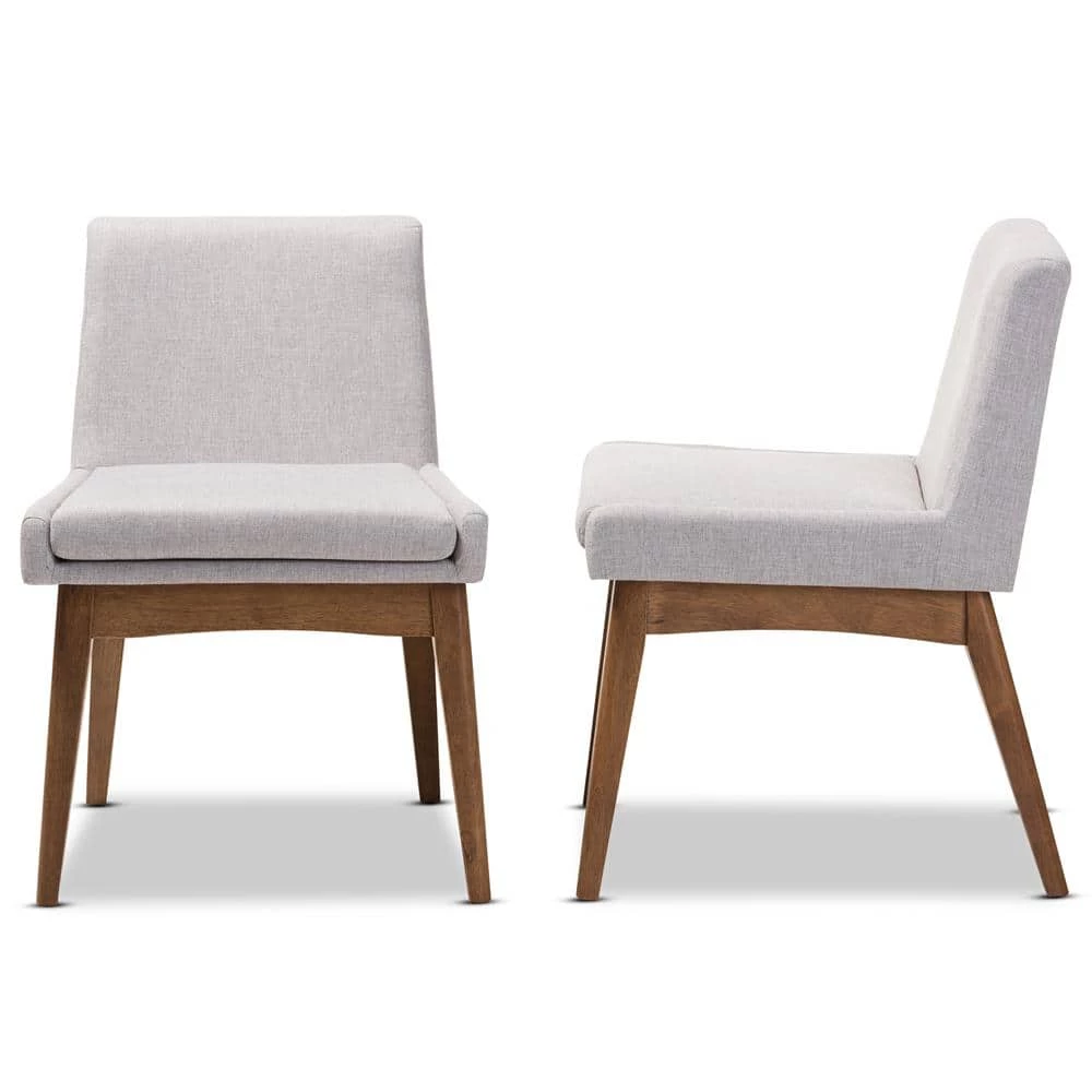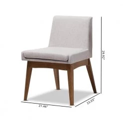 Enriched with finer detailing, the angular and cushioned Nexus dining side chair embraces comfort. Constructed of solid rubberwood frame in dark walnut finishing, the Nexus is upholstered in greyish beige polyester fabric. It’s splayed leg design sets the stage for a mid-century modern appeal to your dining room. Comfortable foam padded seat and back for lasting comfort in enjoying everyday family dinners. Medium seat back that seamlessly tapers down creates a look of modern aesthetic. Made in Malaysia, the Nexus dining chair requires assembly.