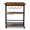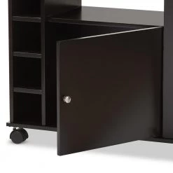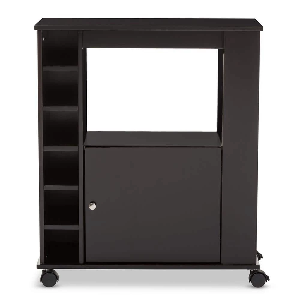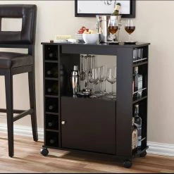 Beautifully crafted with solid rubberwood and MDF in dark brown finishing, the Ontario dry bar and wine cabinet features built in wine rack and storage shelves with rail guards. The Ontario will look fantastic against a wall in any lounge, kitchen or dining room and it could be matched well with other contemporary furniture. The Ontario serves dual function as a wine cabinet and a mobile serving cart too. When you have any party with friends and family, the Ontario could be mobilized to serve your guests. On one side of the wine bar, it is built-in with 6-bottle wine rack while the middle part has an open shelf and a closed door for additional storage. Three additional shelves on the other end provides additional storage space for wine glasses and wine bottles. Great design is as much about style as it is about functionality. The Ontario bar cart, mounted on wheels with locking breaks, makes a fantastic addition to any home bar, kitchen or entertainment area. Made in Malaysia, the mobile wine bar cabinet requires assembly and will be delivered in flat pack.
