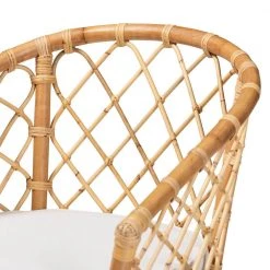 Endow your space with the serene comfort and refreshing design of the Orchard dining chair. Made in Indonesia, this chair is comprised of a natural rattan frame adorned with woven embellishments. Its plush seat features a cushion padded with layers of foam and upholstered in smooth fabric for superb comfort. The Orchard will arrive fully assembled and utilizes sloping armrests for both added comfort as well as a striking silhouette. Offering lavish comfort in charming design, the Orchard dining chair elevates any dining occasion. This is a product of nature and may have variations in areas such as, but not limited to, color, pattern, grain and texture. The hair-like strands of rattan/rattan-fiber are common due to nature of the material.