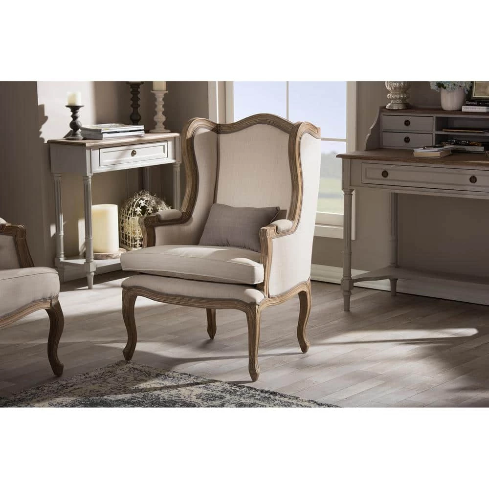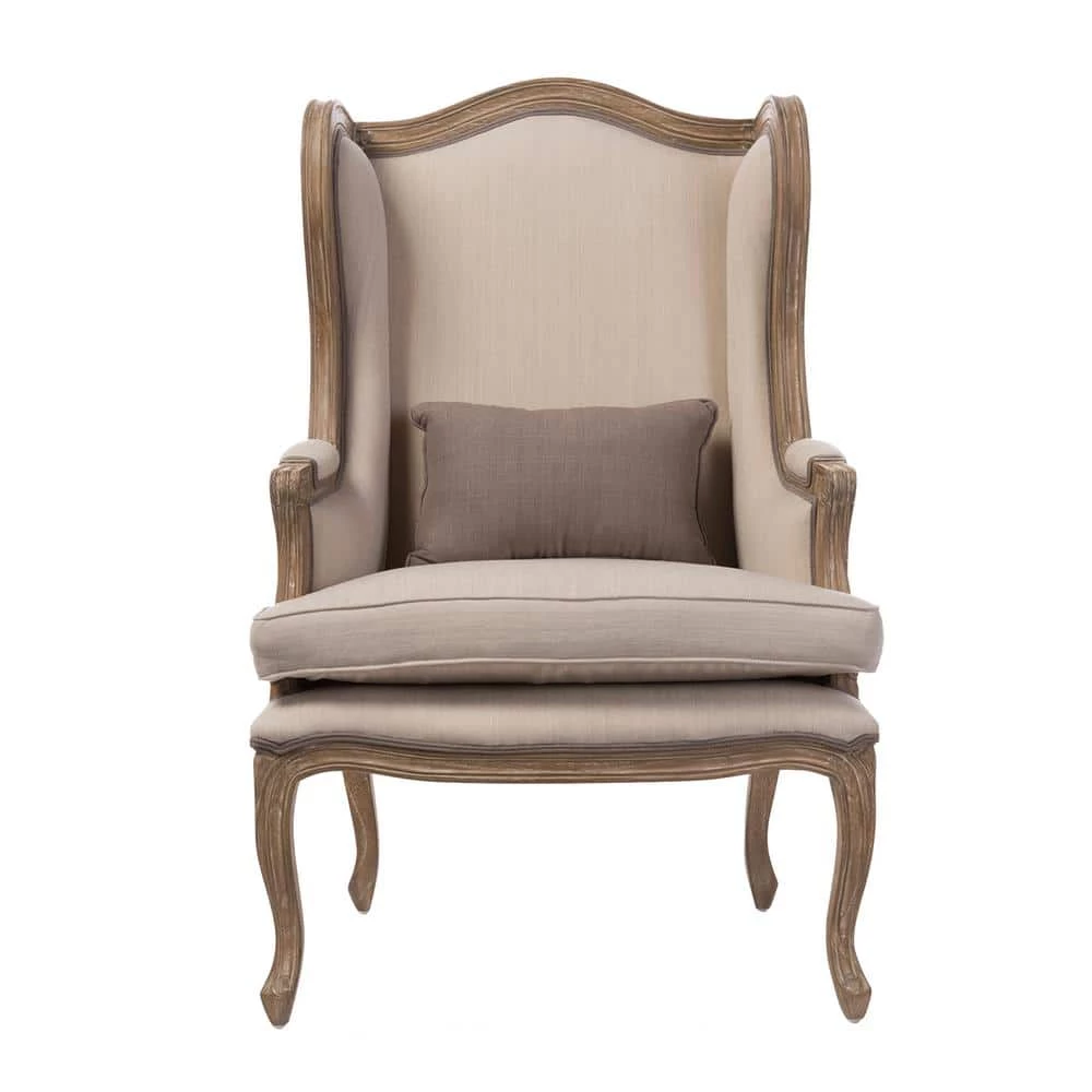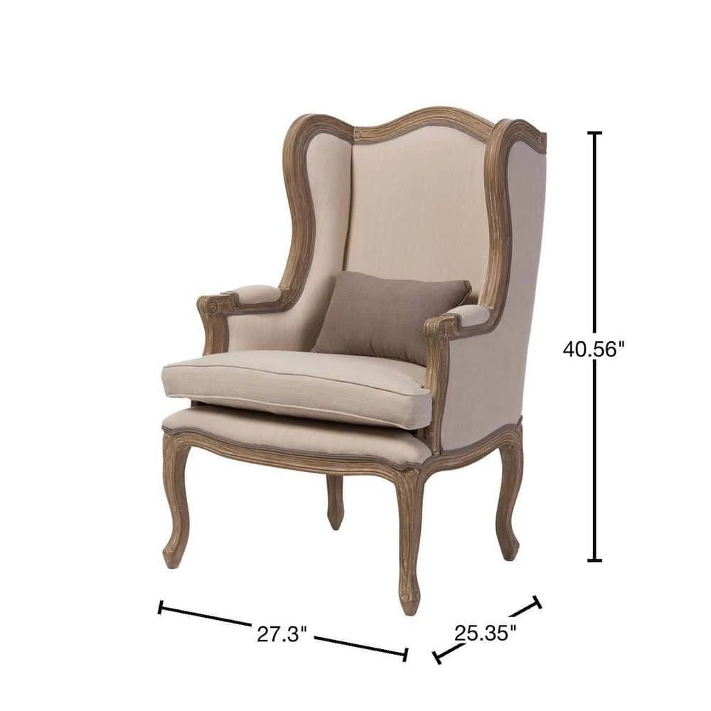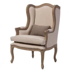 With its hand-carved motifs and resplendent wingback, the Oreille armchair revives a French-style stately charm. Fashioned from solid Mindi wood in oak finishing, no detail is spared on its majestic frame and statement. Neutral two-tone cotton-blend fabric with striped pattern and detailed piping upholster the chair throughout on the back and front. Place beside a fireplace, at a window, or in at the entryway for an old-world look and feel. One of the first things that stand out for the Oreille is its intricate detailing. Precision crafting along the armrest and legs as well as the piping details on the seat add a depth of character that tells a story and history behind the design. More than anything else the Oreille is built to be an accent armchair for comfortably seating of your family or guests. Ideal for sitting back after a long day and enjoying your private space or hosting visitor to your home. Made in Indonesia, the armchair arrives fully assembled.