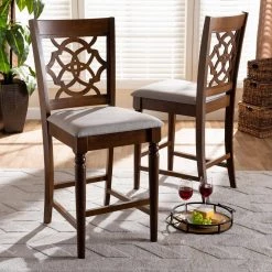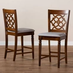 Contemporary design and modern comfort define the Oscar pub chair. Made in Malaysia, the Oscar is crafted from sturdy wood in a traditional square frame. The Oscar pub chair balances form and function with an intricate cut-out design on its back and a soft, foam-padded seat for comfort. The Oscar requires assembly and showcases grey fabric to complement the walnut brown finish of the wood. Ergonomic footrests extend from the legs of the Oscar, making it a comfortable and stylish choice for any dining room.