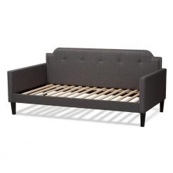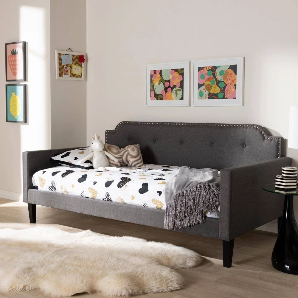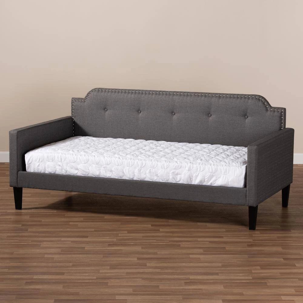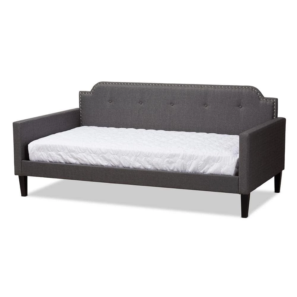 Transform any space in the home from living room to bedroom in just a few simple steps with the Packer daybed. Solidly built from rubberwood and MDF wood, the Packer daybed can be easily converted from a seating area to a sleeping sanctuary. The Packer is foam-padded and upholstered in polyester fabric for comfort and contemporary appeal. Featuring a cut out back panel, the daybed is accented with chrome nail heads for a glamourous, modern look. The Packer daybed is made in Malaysia and requires assembly.