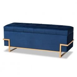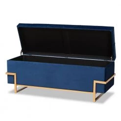 Upgrade your space with the glamorous seating and practical storage offered by the Parker storage ottoman. Made in China, the Parker is comprised of a sturdy wood frame padded with foam and upholstered in smooth navy blue velvet fabric. The cushioned lift-top seat opens to reveal ample storage space, perfect for the living room or as a bed end accent. Fully assembled, the Parker rests on a chic gold finished metal base that lends the piece an eye-catching aesthetic. Extensive storage space, along with comfortable seating, distinguishes the Parker storage ottoman as a fantastic upgrade to the modern home.