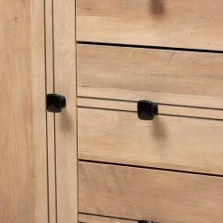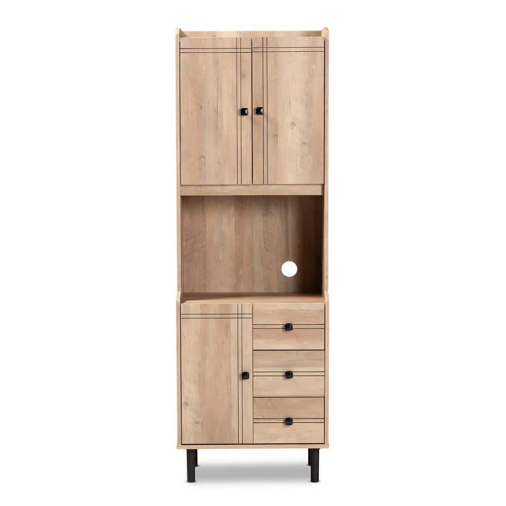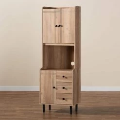 Expand your kitchen with the ergonomic and convenient design of the Patterson kitchen cabinet. Made in Malaysia, the Patterson is comprised of a sturdy wood frame displaying a natural oak brown finish. Three drawers and four internal shelves provide spacious storage for all your kitchen essentials. Requiring assembly, the cabinet features an open shelf fitted with a circular cut-out on its back for easy cord management of kitchen appliances. Square black knobs and rounded black legs lend a modern touch, making the Patterson kitchen cabinet an exceptional addition to the modern home.