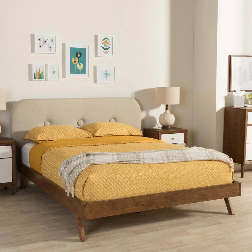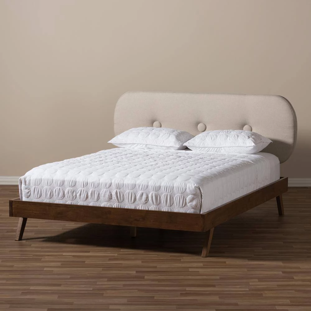 A luxurious upholstered bed with elegant simplicity achieved through the clever use of superb materials. Solid rubberwood frame in walnut finishing in a unique shape elegantly raise the slender body of the platform bed. A delicate frame and soft upholstery materials are the hallmarks of this bed. A touch of sophistication that doesn’t steal the limelight but which adds definition to the bed’s character is the tufting of three big buttons on the oval-shaped headboard, giving the platform bed a visual balance. Gently slanted legs that point purposefully outwards, the Penelope demonstrates seamless joinery. Two support bars attached to the back of the headboard, allowing the adjusting of height of the headboard. To provide extra leaning comfort, the headboard is foam-filled. Made in Malaysia, the Penelope platform bed requires assembly.